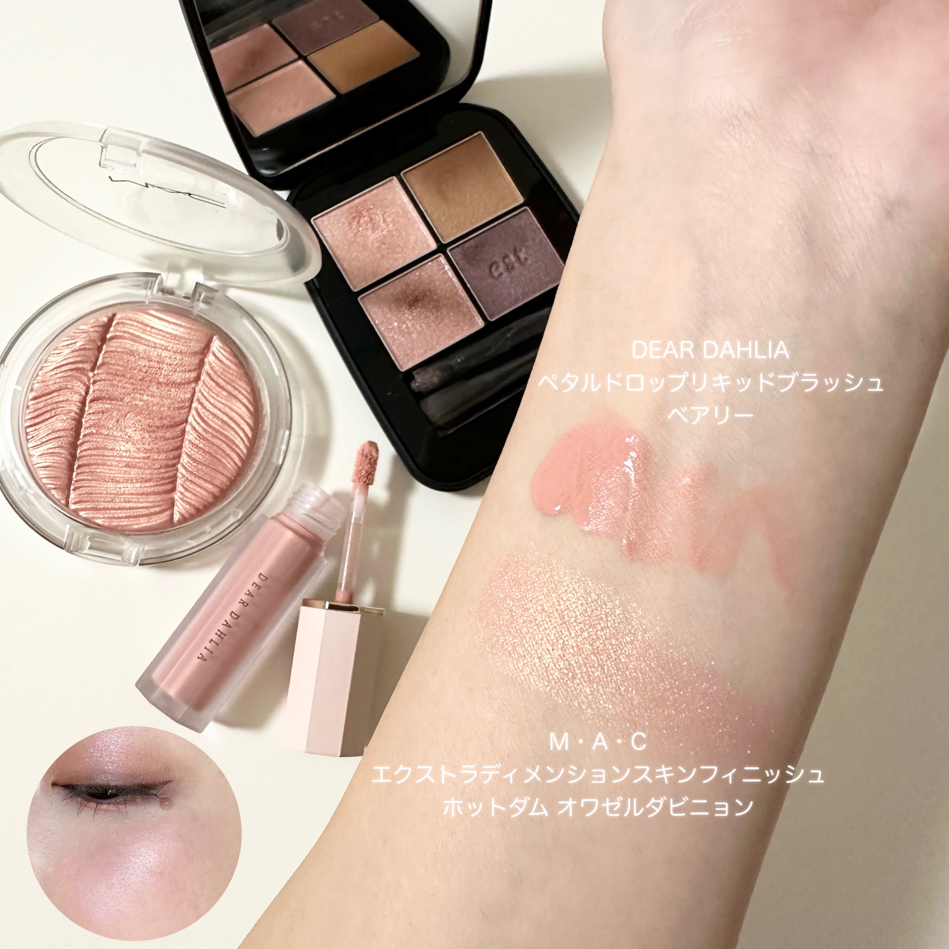 手に試した感じではベースのブルーは弱く、ラメ自体がブルーで可愛すぎる…! BAさんはパウダーアイシャドウのベースにもおすすめと教えてくれたので、 今日はこちらをベースにピンクブラウン系の アイシャドウを使ってメイクしてみたよ🫶🏻 肌に伸ばすとすぐにサラサラになるから ベタベタが残ったりしないし、 パウダーアイシャドウの上に重ねてもヨレない◎
