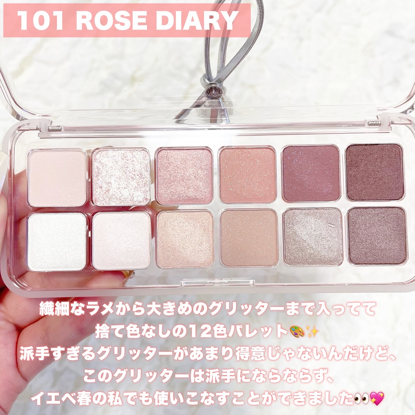 滑らかな塗り心地で粉飛びなく、トレンディなグラデーションメイクが可能なハイクオリティーパレットなんだって🫶🏻 多彩に輝くグリッターとラグジュアリーなムードを込めた新作可愛すぎない!?😭💕 柔らかめのふんわりとした発色でまさにイエベ春の私が求めてたアイシャドウで感動しました😭💕