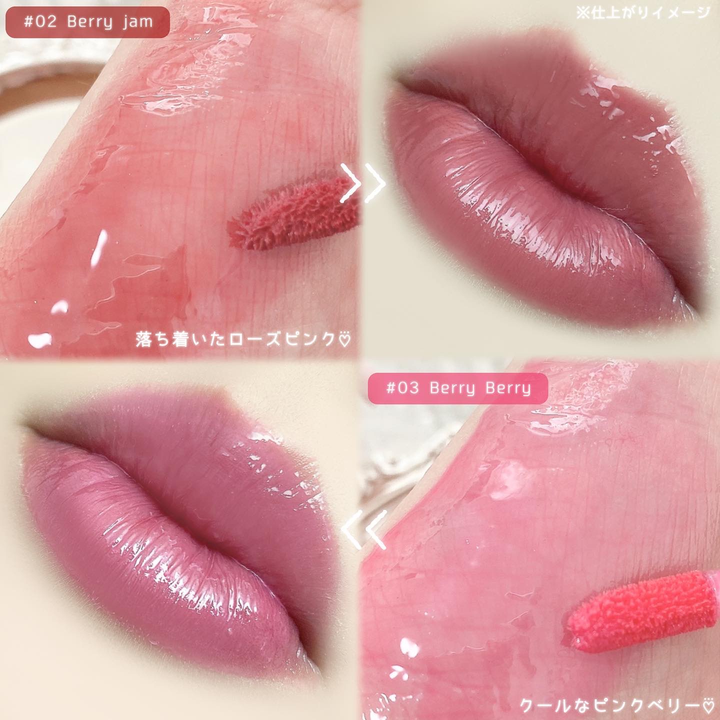 いちごゼリーのような見た目が可愛すぎるよね🍓🩷 ぷるぷるもっちりな唇に仕上げてくれるよ☺️ 色味が好みすぎる🥹❤️かわいい、、、、わたしは今回ベリーバブルとベリージャムを使ったよ! はちみつエキス配合で保湿力もありつつゼリーのような光沢感がたまらん🤤💓