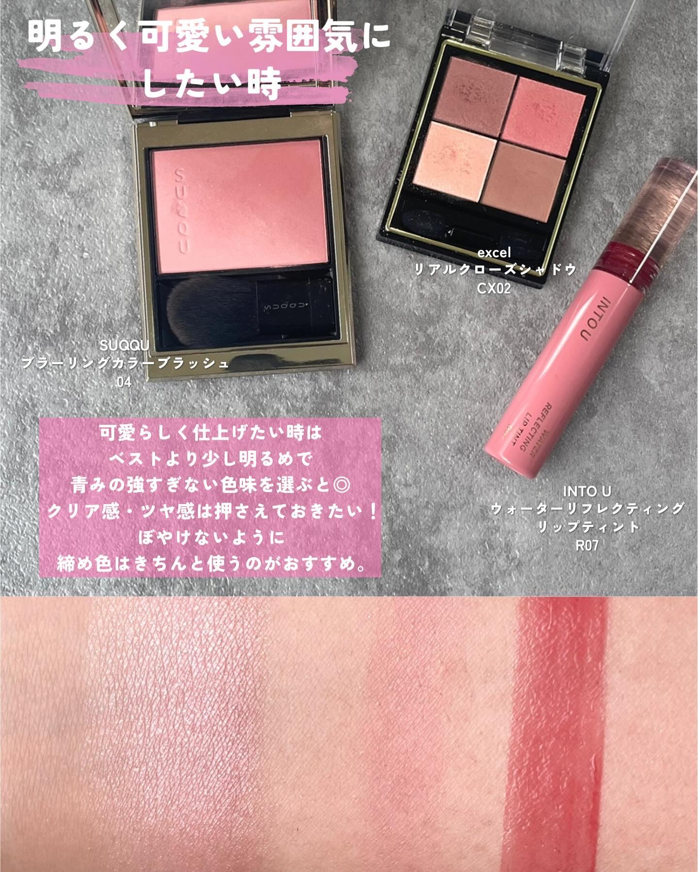 粉質がすごく良くなって、しっとり感とツヤ感が強くなりました! 04が個人的大ヒットで🥹💯 他のチークと混ぜて使うと、ツヤっぽくほわーっとした色付きになって最高! チーク要らない派の方に是非試してみて欲しいカラーです🫶🏻