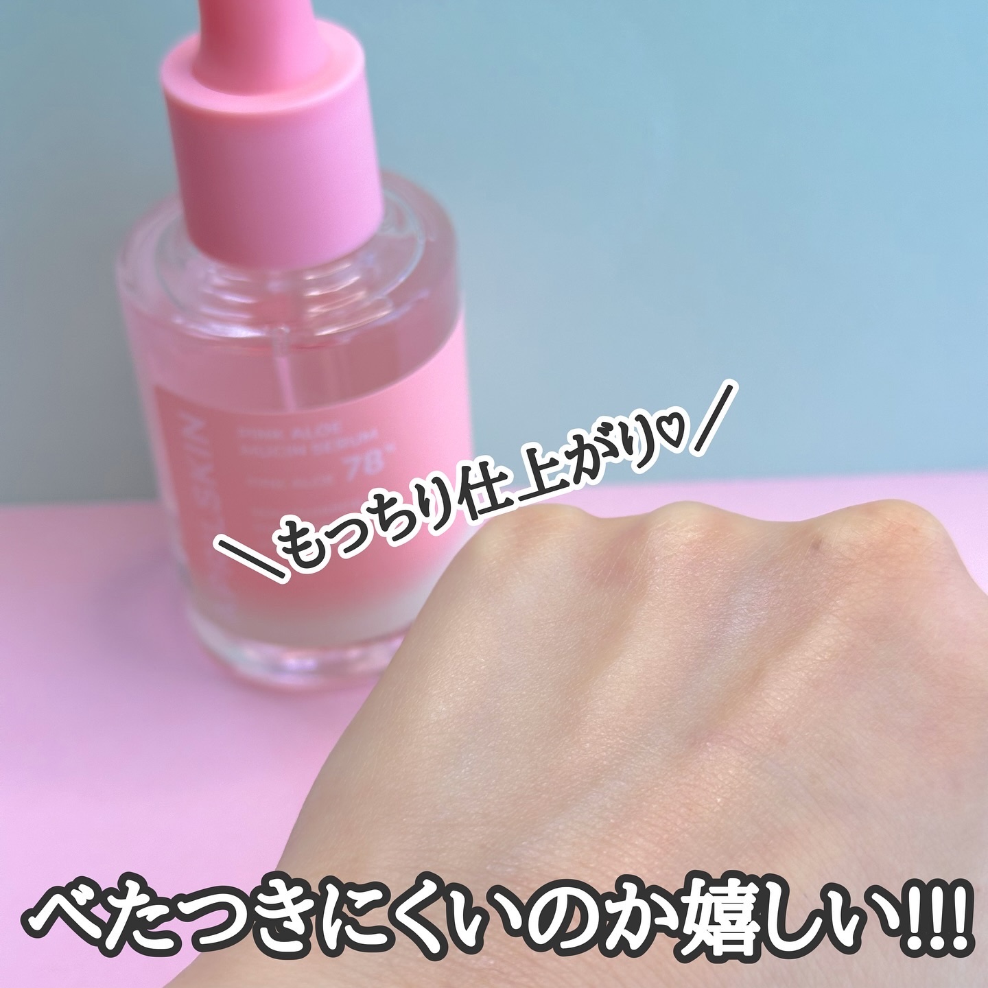 このセラムはピンクアロエ78%配合で美白に特化!一般のアロエより198%もピンクアロエの方が効果が高いんだって...!! テクスチャーがびよーんと伸びるほどとろみのある感じで、でもなじませると潤いだけを残して落ち着くからベタつきなしˊ˗ もちろん思い感じもなく、水分で満たされたツヤ肌になるよ𓂃