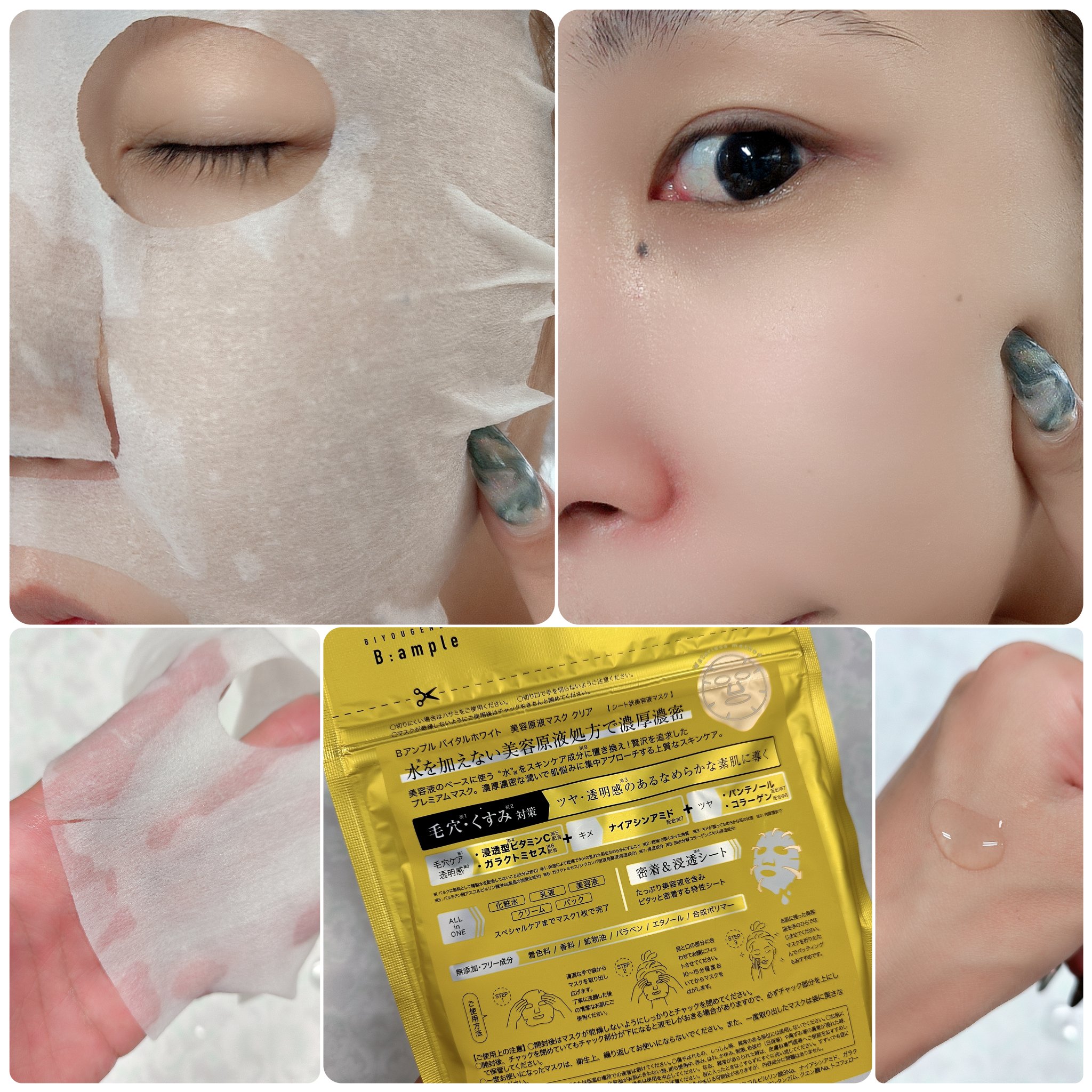 シートマスクの大部分を占めると言われる『水』をコラーゲン原液に置き換え、贅沢を極めた『水を加えない』美容原液マスクとのこと。 浸透型VC、ガラクトミセス、ナイアシンアミドと嬉しい成分が配合されていて、毛穴・くすみにアプローチするクリアタイプ。 パッケージのイエローがビタミンCを連想させてくれるので気分上がります♪