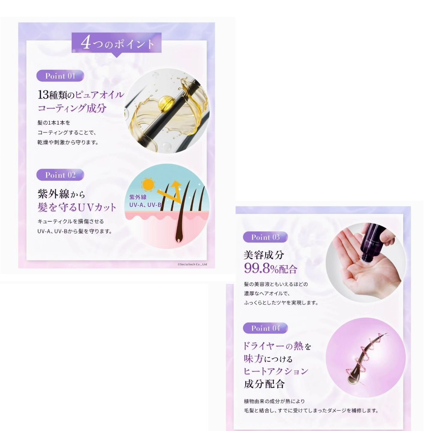 ノンシリコン処方で4種のオーガニック成分配合:髪をいたわり、頭皮に優しい処方です。 20種の美容成分を99.8%配合:20種類の厳選された美容成分を99.8%配合。 オイルなのにさらっとしたテクスチャ べたつかないのがいいですね。