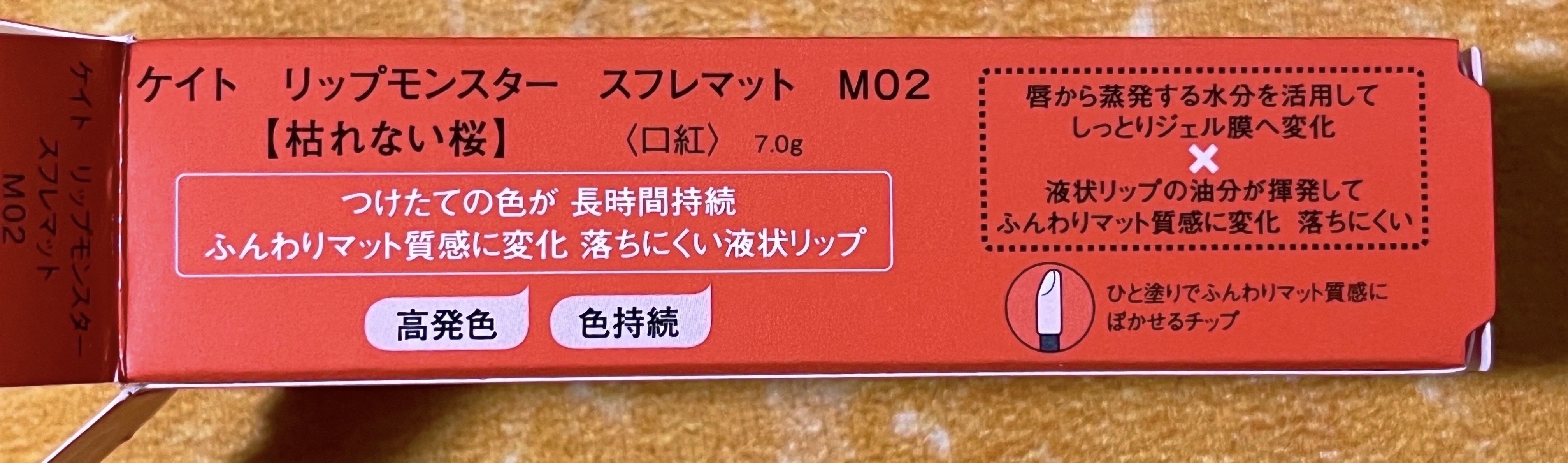 - つけたての色が長時間持続 ふんわりマット質感に変化 落ちにくい液状リップ ■高発色スフレ処方:唇から蒸発する水分を活用してしっとりジェル膜へ変化 液状リップの油分が揮発してふんわりマット質感に変化 ■リップモンスターの機能を踏襲 つけたそのままの色が長時間持続 マスクをしても色落ちしにくい 飲み物を飲んでもカップにつきにくい