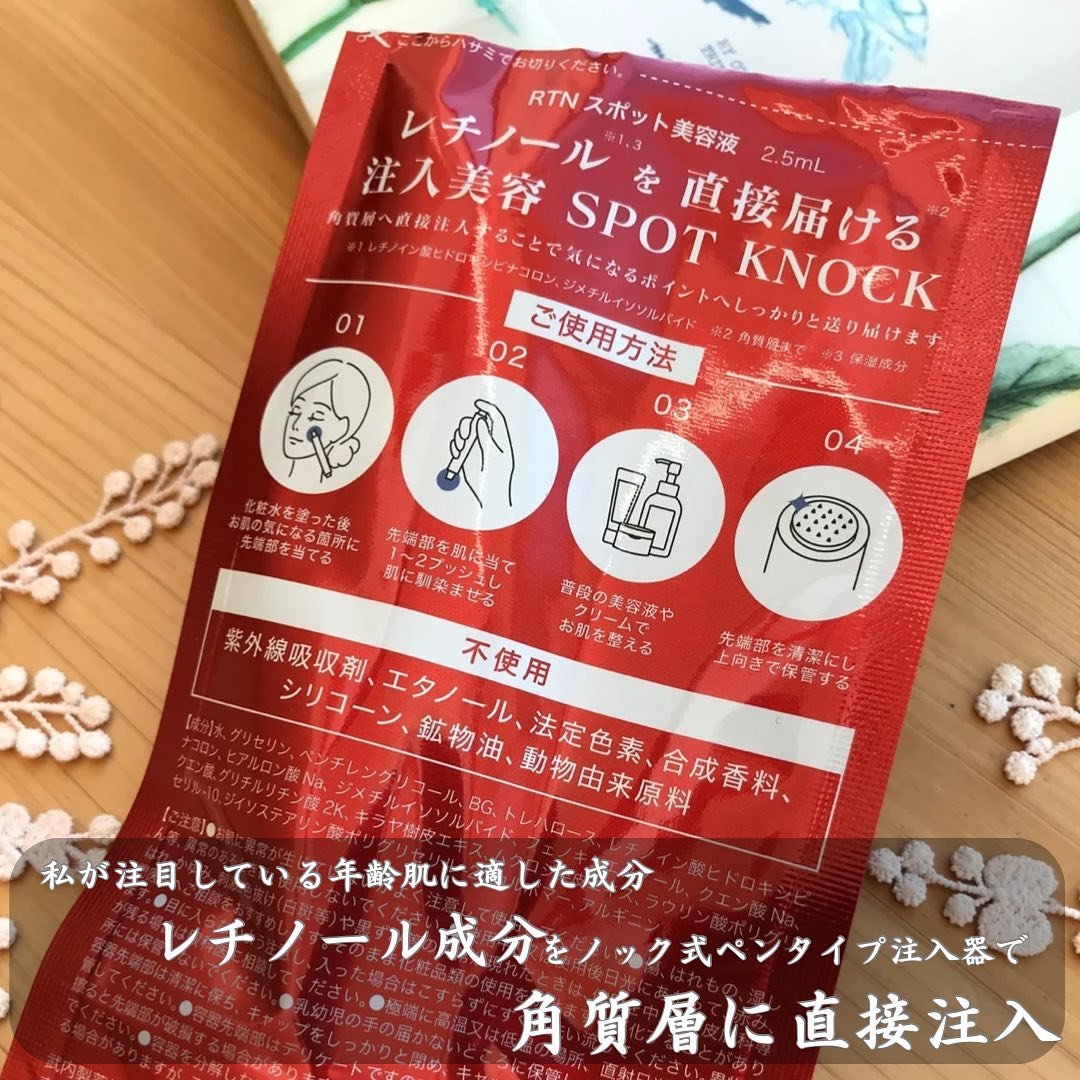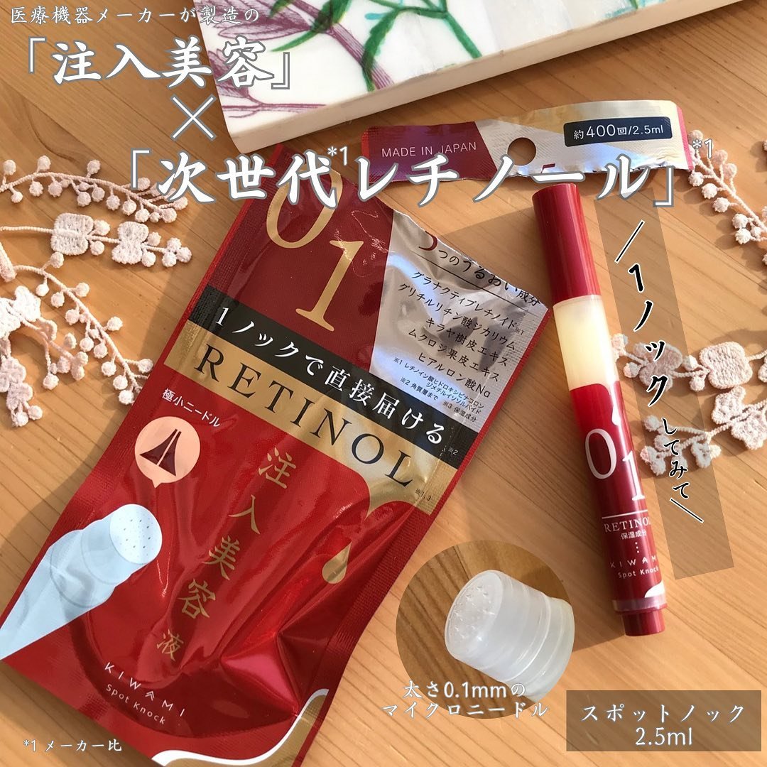 - ★注入型マイクロニードル美容液で角質層に直接注入 気になる目元/口元にノック式ペンタイプ注入器で角質層に直接注入することが出来ます。針は太さ0.1mmの極細針を採用しました。 ★次世代型*1レチノール レチノールとは、年齢肌をケアする整肌成分として今、注目されているビタミンAの1種です。 ・次世代型*1ビタミンA 「グラナクティブ レチノイド」を採用 グラナクティブレチノイドは米国Grant Industries社が開発したレチノイド。 刺激性*2、安定性を追求した次世代型ビタミンAです。グラナクティブレチノイドは直接型レチノイドなので、肌に優しい使い心地です。 繊細な目の下や目尻、首元にも使用することができます。 *1自社比 *2全ての人に刺激が起こらないという訳ではありません