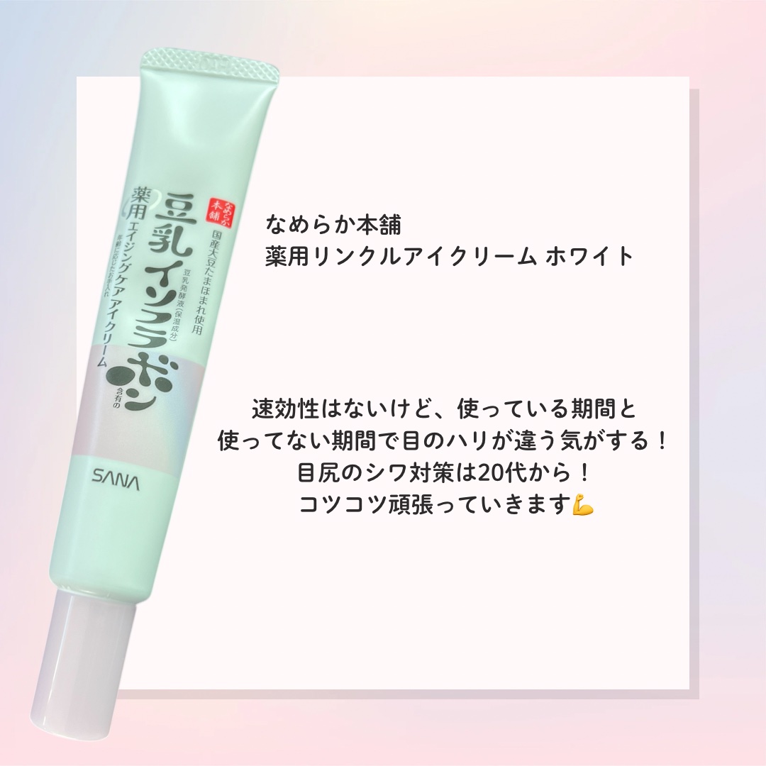 なめらか本舗薬用リンクルアイクリームホワイト目元のケア始めるならまずこれ使っておけば🙆♀️しっかり実感できます🍀*゜(目元が皮膚薄くて乾燥しやすいってことも)何気によく触れて摩擦になっている部分だからこそ若いうちから目元ケア大事😳❤️#アイ...