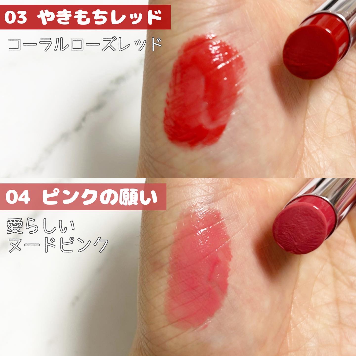 - ・じゅわっと透明感*¹ ある美発色 ティントでありながらも自然なリップカラーを演出。 見たまま美発色で唇を彩り、グロウなテクスチャーでありながらカラーフィクシングが可能。 ・ひと塗りでボリューム感*¹ と、とろける光沢感を演出 独自成分*² により反射光を効果的に演出し、唇の皺を見えにくくする。 また、モイスチャー感と光沢感もキープし、生ツヤっぽい光沢感を演出。 ・クリアなレイヤリングカラー 厚みのない、塗れば塗るほどきれいな発色。 ヌーディ系のライトとミュートカラー展開。 *¹ メイクアップ効果 *² アルミナ成分