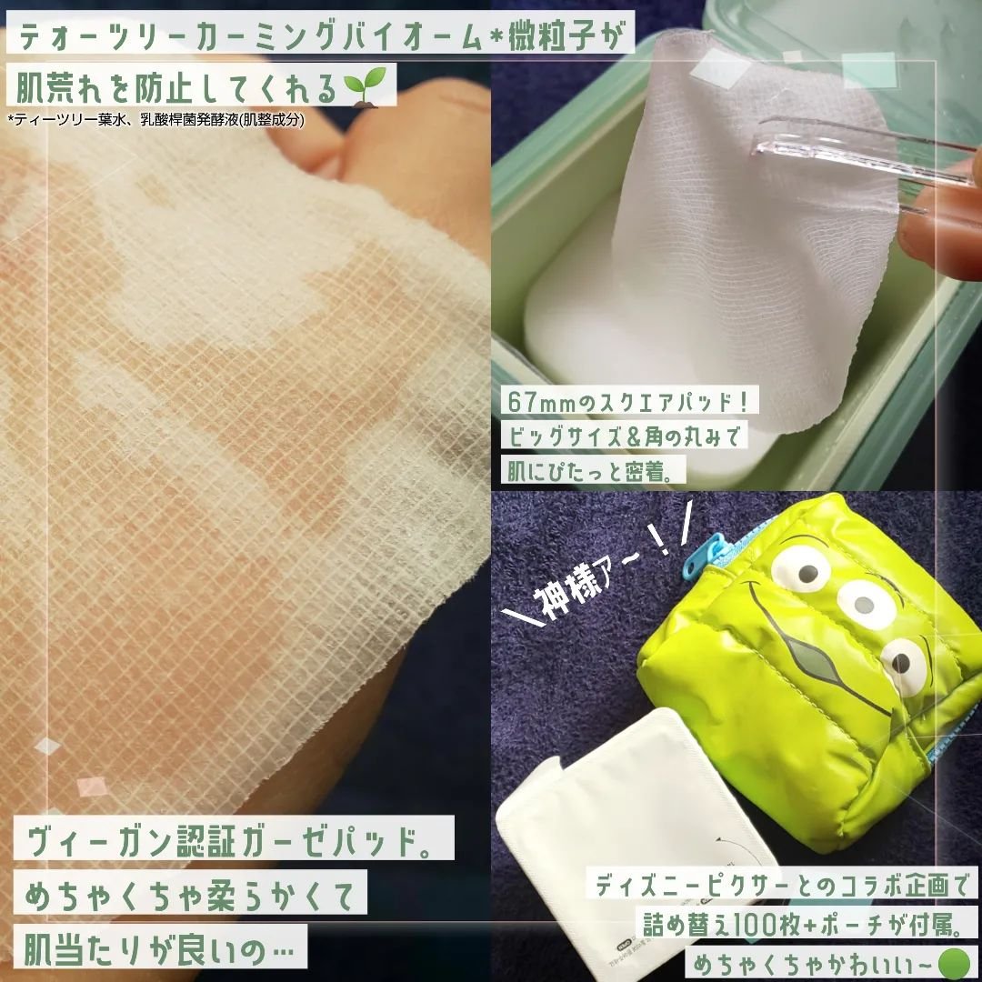 - 1日の始まりと終わりのケアに。 お肌に合わせて選べる100入りトナーパッド4種 肌荒れ防止ケアエッセンスをたっぷり含んだ、カーゼ素材のパッドでなめらかな肌へとケアします。 済州産ティーツリーに乳酸菌を加え、200時間抽出したティーツリーカーミングバイオーム配合。 べたつかない爽やかな使い心地のトナーパッドです。 ■67mmスクエアパッド 大きく四角いパッドが肌にぴったりと密着。拭き取りパッド・パックとしてご使用いただけます。 最後の1枚まで衛生的に使用できるピンセット付。