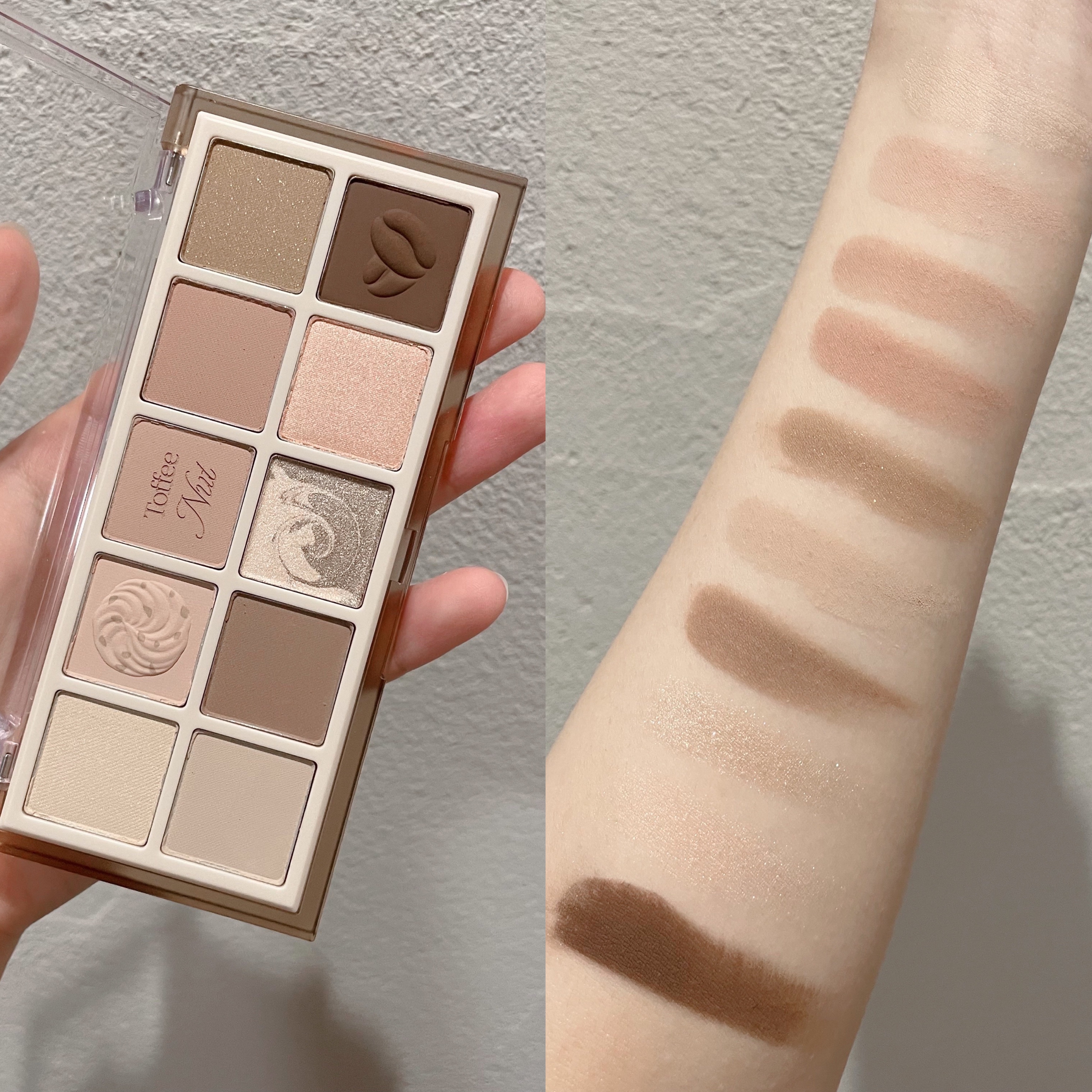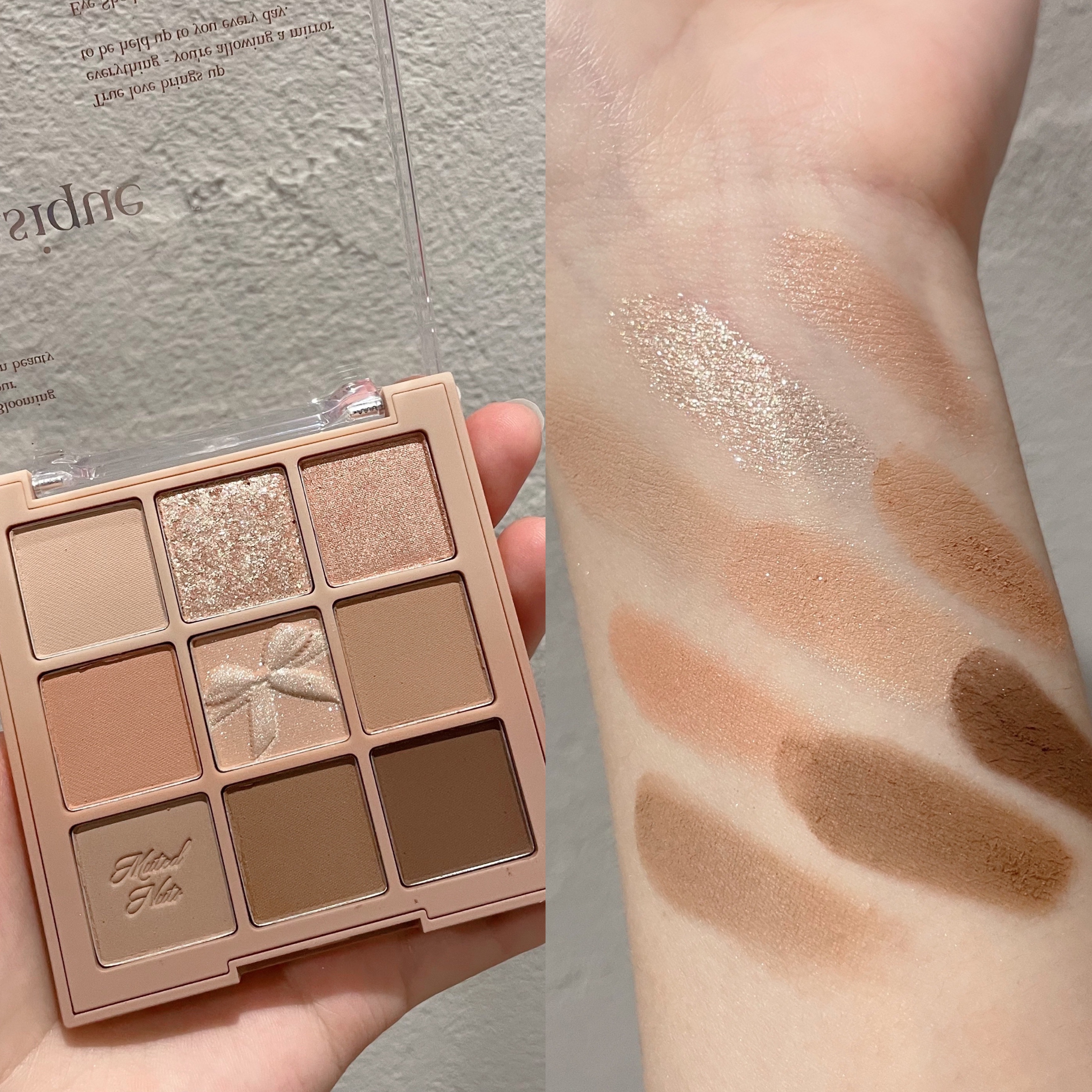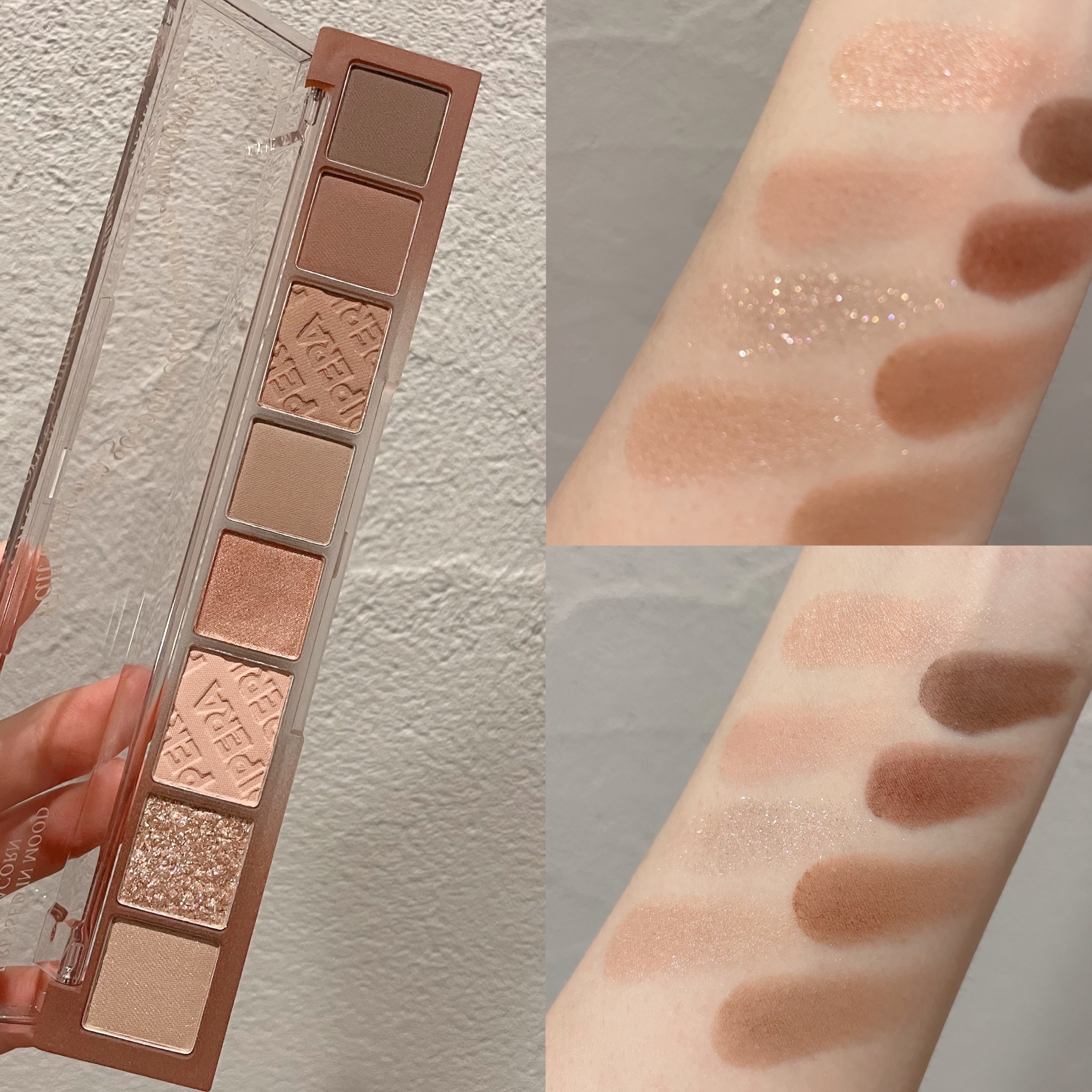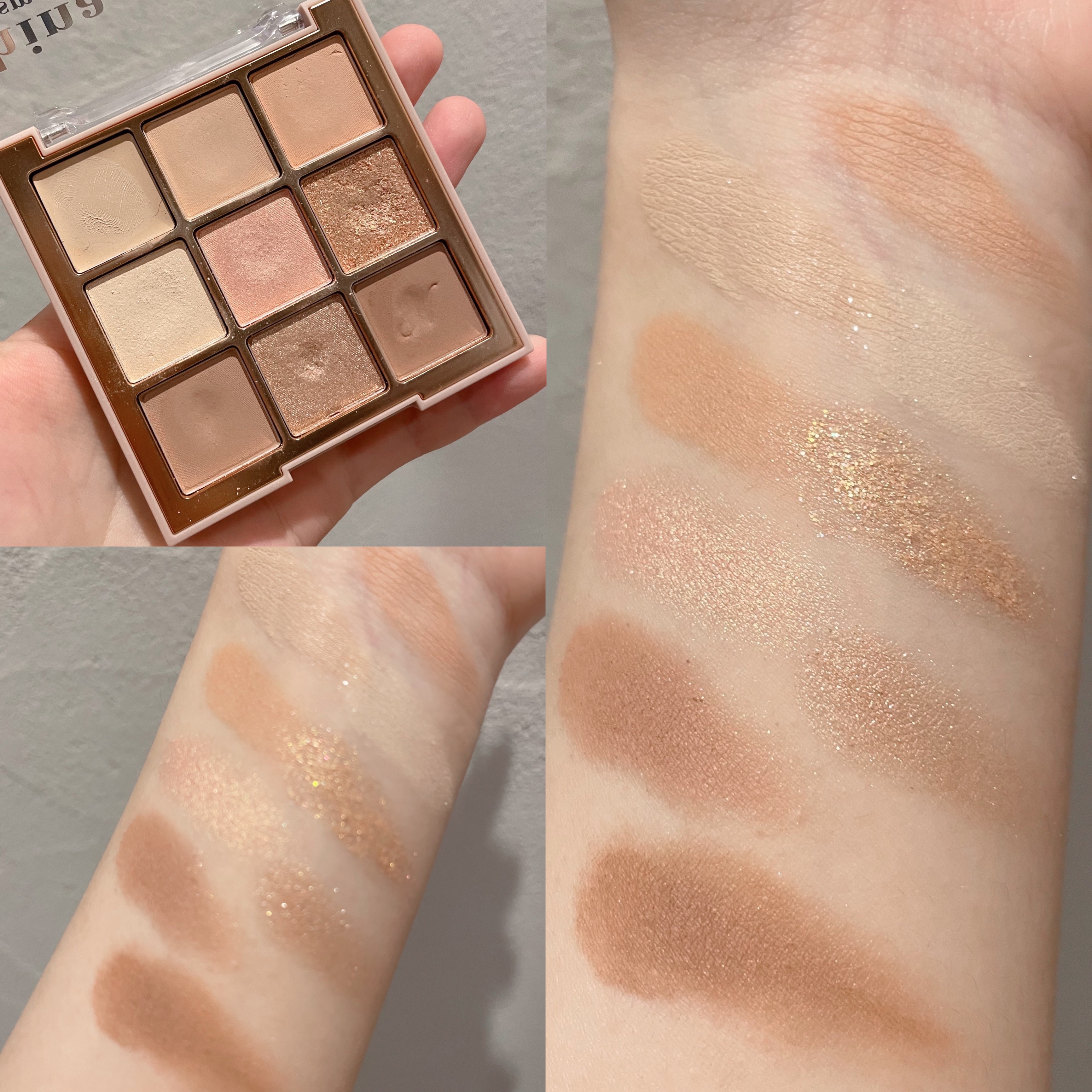全体的にほんの〜りピンク味が入ったカラーで、ナチュラルなのにめちゃくちゃ盛れます!! ラメは超しっとり。密着してくれるからラメ飛びもしません。 粉質も柔らかくてふわふわマット。ラメを乗せないメイクもこのパレットだけでしっかり陰影が作れてヌーディーな雰囲気になれます♡