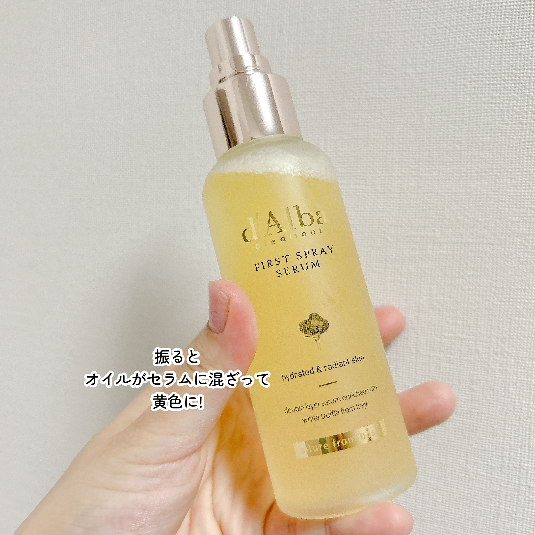 - イタリア産ホワイトトリュフ*と植物性オイルで豊かな水分を与えツヤ肌に仕上げる保湿ケアミストです。肌表面の保湿だけでなく、内側までしっかり二重で保湿可能。さらにダルバ独自のトリュフェロールTMが肌に弾力を与えます。霧のような細かなミストで洗顔後やお風呂上り以外のメイクの上からでもメイクを邪魔することなく使用することができます。 *ツベルマグナツムエキス(保湿成分) イタリアヴィーガン認証V-LABEL取得 皮膚低刺激テスト済み *全ての方に皮膚刺激が発生しないということではありません。 【ご使用方法】 1. 洗顔後、3~5回振って中身が十分に混ざった後、顔全体にまんべんなく噴射して軽くたたいて肌に馴染ませます。 * 鼻や口から吸い込まないように注意してください。 【使用上の注意】 お肌に異常が生じていないかよく注意して使用してください。化粧品がお肌に合わないとき即ち次のような場合には、使用を中止してください。そのまま使用を続けますと、症状を悪化させることがありますので、皮ふ科専門医等にご相談されることをおすすめします。 (1)使用中、赤味、はれ、かゆみ、刺激、色抜け(白斑等)や黒ずみ等の異常があらわれた場合 (2)使用したお肌に、直射日光があたって(1)のような異常があらわれた場合