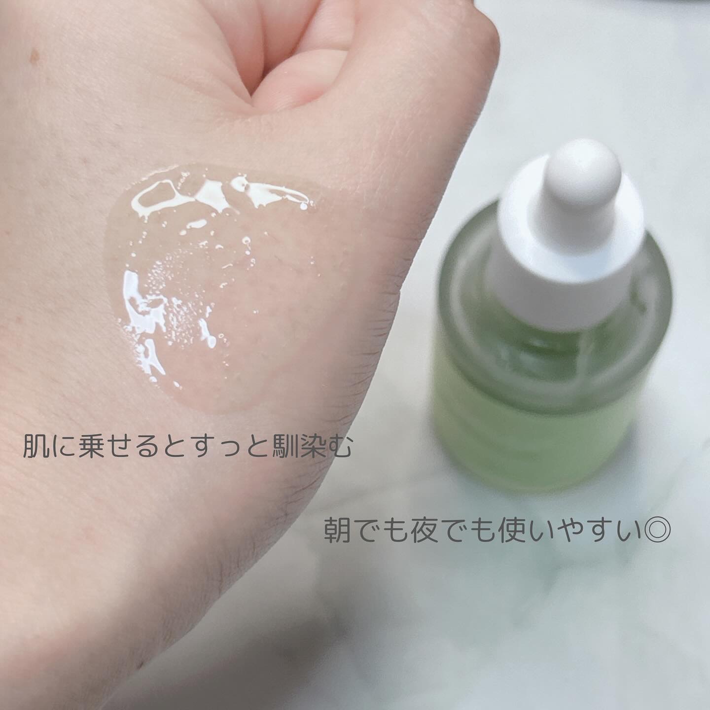 ニキビ鎮静成分84%の高濃縮アンプルです。シカより5.3倍強く急速鎮静とぎっしり水分チャージします。 テクスチャーはとろんとしてジェリーのようです。水分たっぷりなのが肌に乗せた瞬間に分かるほどにプルプルしています。 無着色&香料不使用なのは嬉しい。スポイトで一定量取れるのも好印象です。