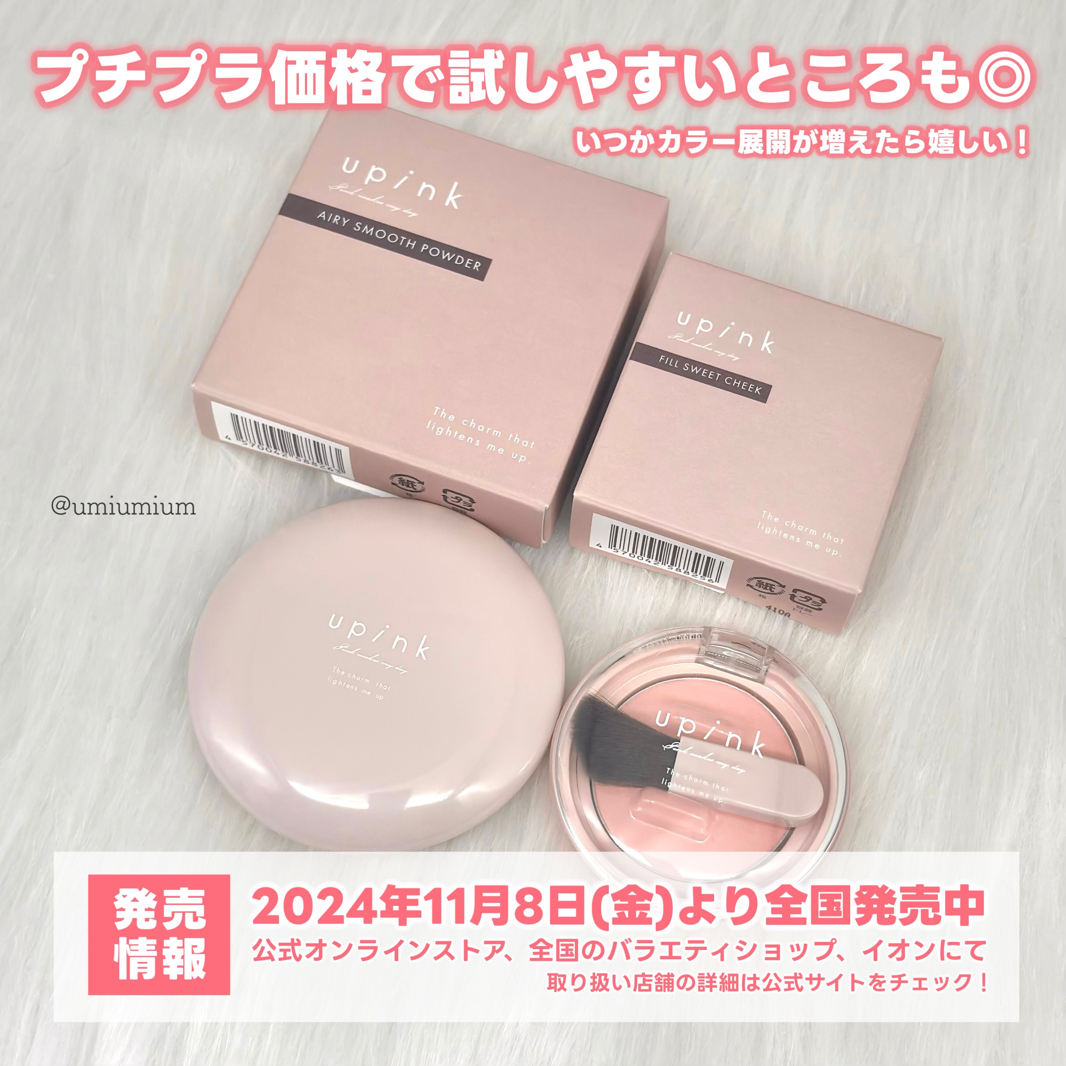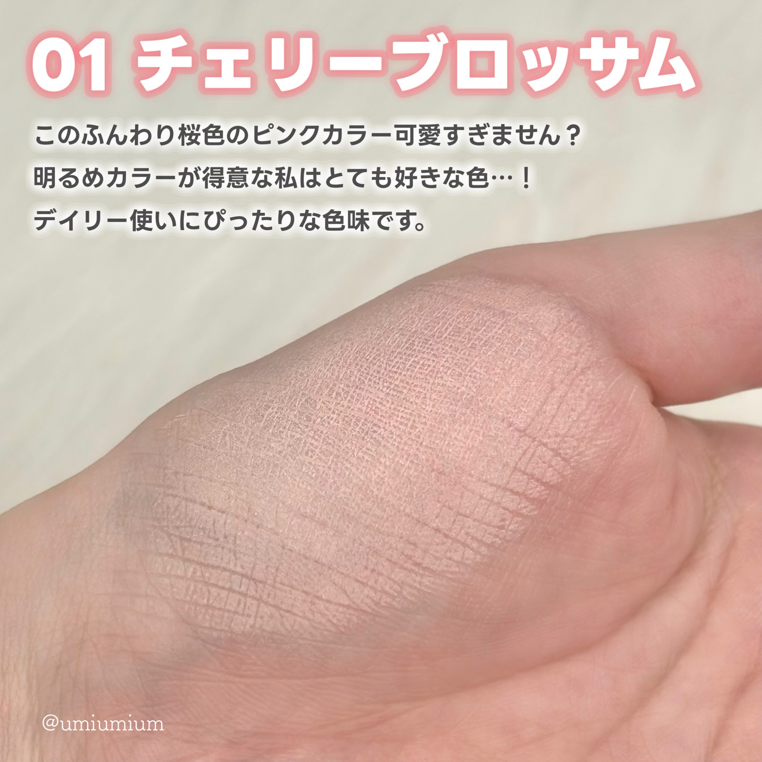 触れたくなるさらふわ肌♡ エアリースムースパウダー 1,980円(税込) 細かなラメ入り!透明タイプだけどめちゃくちゃ綺麗に見える! 崩れにくくて良かった! 01チェリーブロッサム あたたかな春の微笑みを感じる桜コーラル ふんわりマットな仕上がり!白みがあるカラーでふっくら多幸感のある印象に仕上がります♡ 仕上がりの良さにすっかりupinkに沼ってしまった!!! 色々集めたい!ぜひぜひチェックしてみてください!