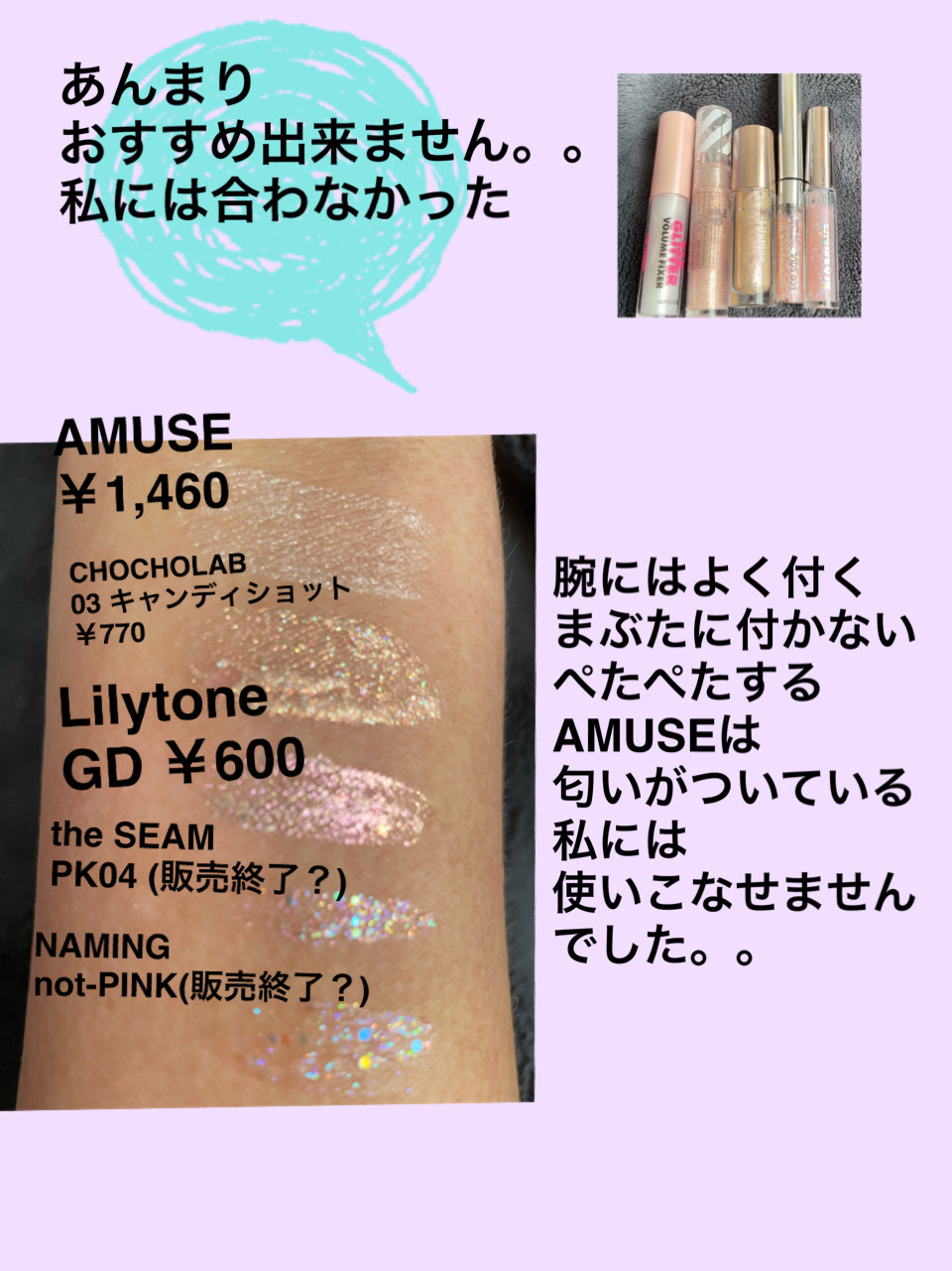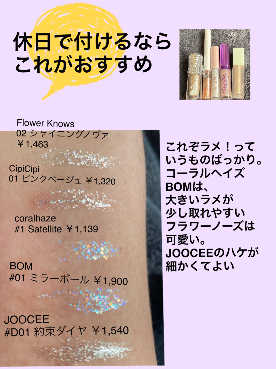 ルミアグラスはピンク色の発色がきちんと出るので、1本で決まります。 ラメも発色も大人しめなので、普段使いにぴったりです! 涙袋を、コンシーラーで強調させた後に乗せるならヒロインメイク! 発色は弱めだけど、ラメがびっしりなので、まるでグリッターをのせたように仕上がり! リリーフルールはラメが少ないので、なんとなく夕方ラメがいなくなったような印象を受けました。 発色もラメも大人しめなので、リキッドで塗ってもムラは目立ちにくい印象です。