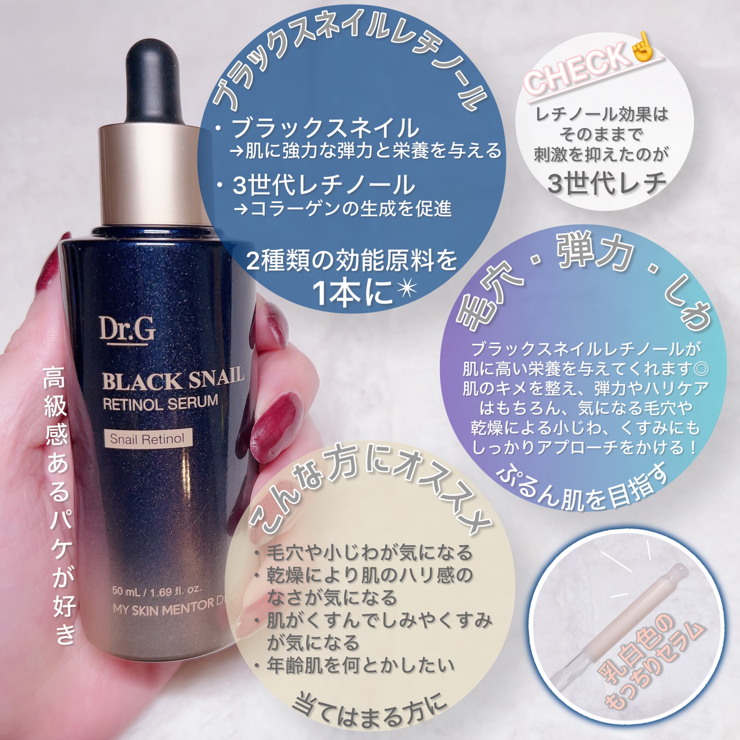 - ブラックスネイル*とレチノール*を配合した、若々しい肌印象に導く美容液です。 Dr.Gのレチノールは独自の成分である、ブラックスネイルレチノール*を使っています! 肌に高い保湿感を与え、肌のキメを整え、弾力やハリのケアを助けるだけでなく、肌の乾燥くすみをケアし、明るい印象のぷるんっとハリのある肌に導きます。 *整肌成分
