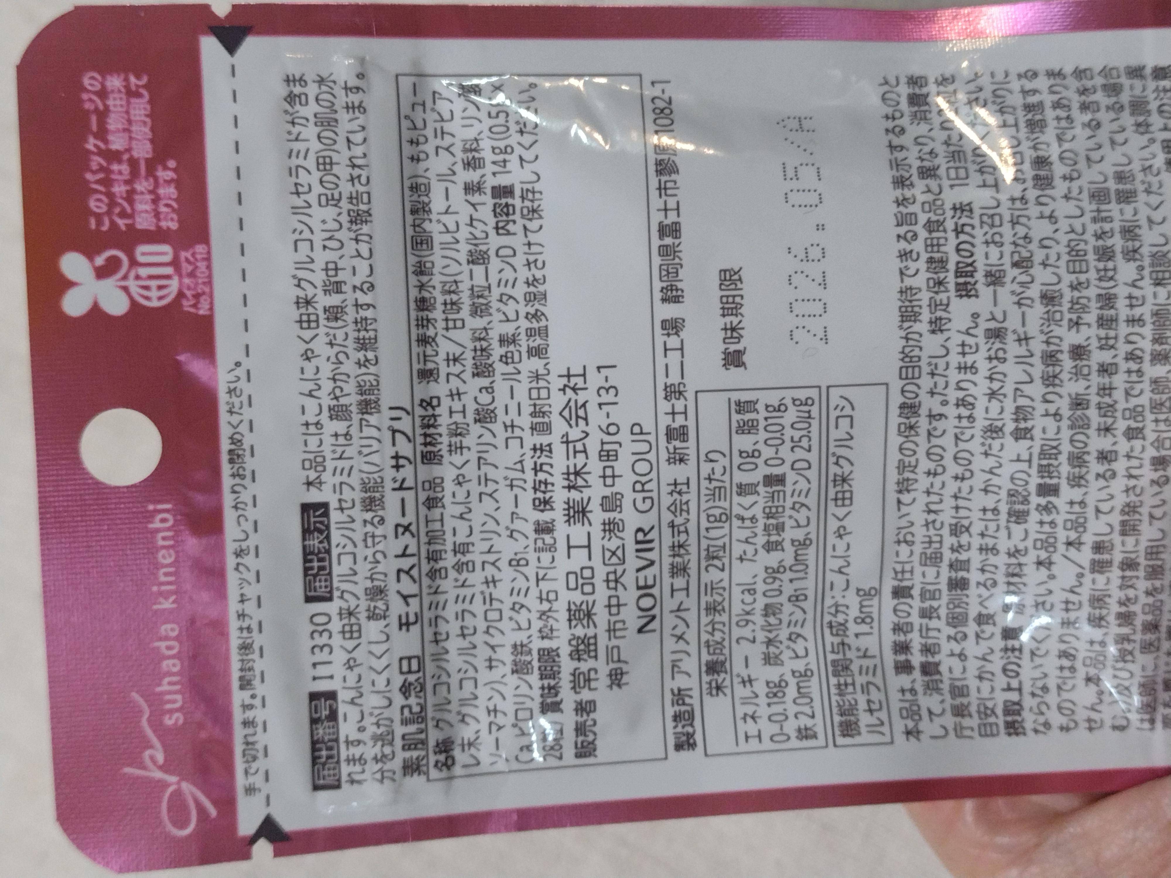 - ○「こんにゃく由来グルコシルセラミド」を配合した機能性表示食品 顔やからだ(頬、背中、ひじ、足の甲)の肌の水分を逃がしにくくし、 乾燥から守る機能(バリア機能)を維持することが報告されている「こんにゃく由来グルコシルセラミド」を 1.8mg 配合。 ○サポート成分として鉄 2mg、ビタミンB₁1mg、ビタミンD25 ㎍も配合 ○1日摂取目安量 2 粒、食べやすいタブレットタイプのサプリメント ○甘すぎない優しい大人ピーチティー味で美味しく続けやすい <1日摂取目安量> 1 日当たり 2 粒を目安にかんで食べるかまたは、かんだ後に水かお湯と一緒にお召し上がりください。 <摂取上の注意> 原材料をご確認の上、食物アレルギーが心配な方は、お召し上がりにならないでください。 本品は多量摂取により疾病が治癒したり、より健康が増進するものではありません。 <使用上の注意> 開封後はなるべく早めにお召し上がりください。 温度差で結露が生じる場所(冷蔵庫からの製品の出し入れ等)をさけて保存してください。 <その他の表示> 本品は、事業者の責任において特定の保健の目的が期待できる旨を表示するものとして、消費者庁長官に届出されたものです。ただし、特定保健用 食品と異なり、消費者庁長官による個別審査を受けたものではありません。 本品は、疾病の診断、治療、予防を目的としたものではありません。本品は、疾病に罹患している者、未成年者、妊産婦(妊娠を計画している者を含 む。)及び授乳婦を対象に開発された食品ではありません。疾病に罹患している場合は医師に、医薬品を服用している場合は医師、薬剤師に相談して ください。体調に異変を感じた際は、速やかに摂取を中止し、医師に相談してください。 食生活は、主食、主菜、副菜を基本に、食事のバランスを。