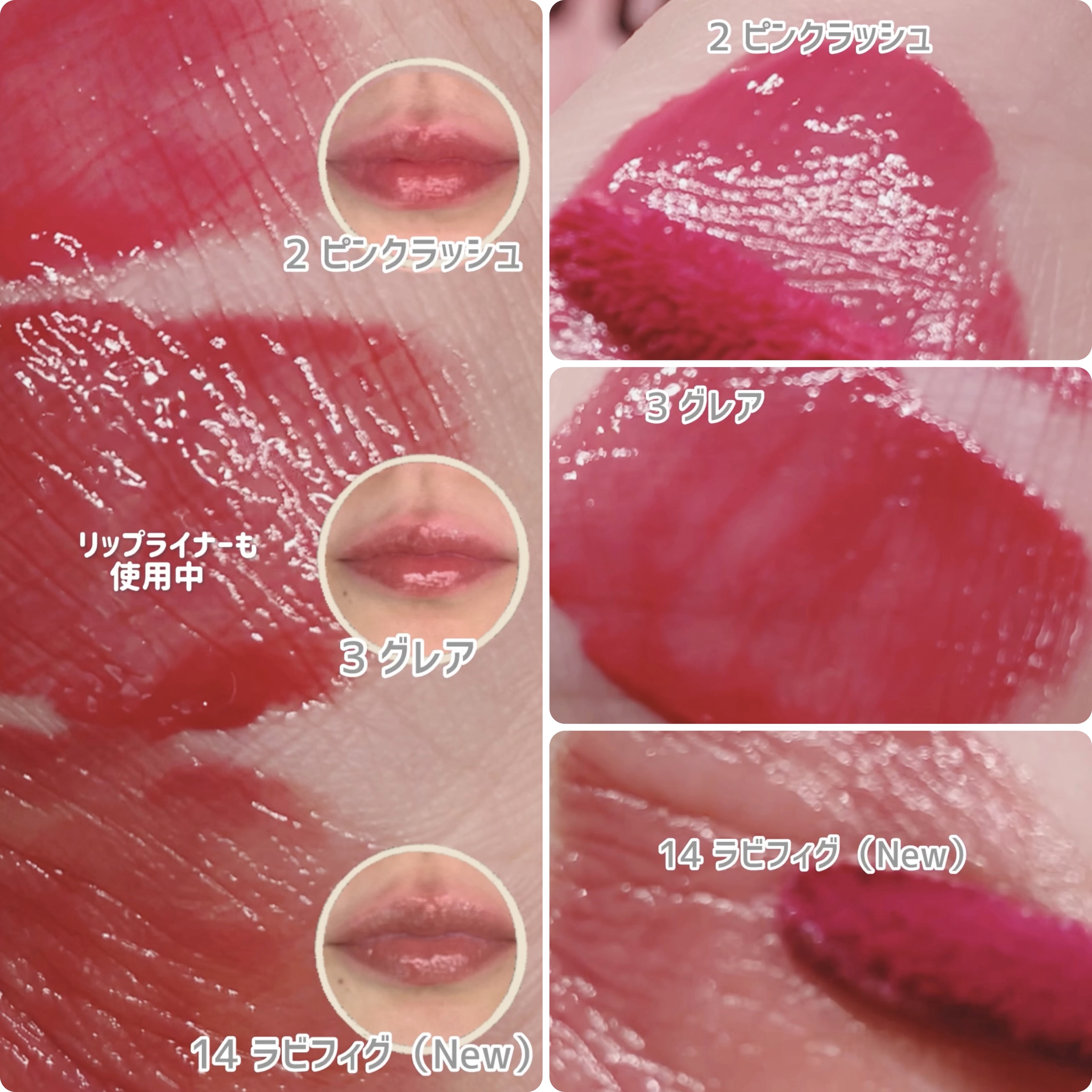 - <01 ソフィー(Surfy)> リンゴ酸ジイソステアリル、ジフェニルシロキシフェニルトリメチコン、精製水、ジフェニルジメチコン、ビスジグリセリルポリアシルアジペート-2、水添ポリイソブテン、ポリグリセリン-3、ポリソルベート60、セチルPEG/PPG-10/1ダイメチコン、イソステアリン酸ソルビタン、BG、ペンチレングリコール、1,2-ヘキサンジオール、ダイメジメチコン、アクリル酸ヒドロキシエチル/ナトリウムアクリロイルジメチルタウリン酸共重合体スクアラン、セテアレス-20、二酸化チタン、エチルヘキシルグリセリン、赤色227号、黄色5 号、香料、赤色104号(1)、水酸化酸化アルミニウム、ポリアクリル酸アンモニウム溶液、黄色4号、フェノキシエタノール、マカデミア種子油、ローズヒップ油、ツバキ油、トコフェロール <02 ピンクラッシュ(Pinkrush)> リンゴ酸ジイソステアリル、ジフェニルシロキシフェニルトリメチコン、精製水、ビスジグリセリルポリアシルアジペート-2、ジフェニルジメチコン、水添ポリイソブテン、ポリグリセリン-3、ポリソルベート60、セチルPEG/PPG-10/1ダイメチコン、イソステアリン酸ソルビタン、BG、ダイメジメチコン、ペンチレングリコール、1,2-ヘキサンジオール、アクリル酸ヒドロキシエチル/ナトリウムアクリロイルジメチルタウリン酸共重合体スクアラン、セテアレス-20、二酸化チタン、エチルヘキシルグリセリン、赤色227号、黄色5 号、香料、水酸化酸化アルミニウム、ポリアクリル酸アンモニウム溶液、フェノキシエタノール、マカデミア種子油、ローズヒップ油、ツバキ油、トコフェロール <03 グレア(Glare) > リンゴ酸ジイソステアリル、ジフェニルシロキシフェニルトリメチコン、精製水、ビスジグリセリルポリアシルアジペート-2、ジフェニルジメチコン、水添ポリイソブテン、ポリグリセリン-3、ポリソルベート60、セチルPEG/PPG-10/1ダイメチコン、イソステアリン酸ソルビタン、BG、ペンチレングリコール、1,2-ヘキサンジオール、ダイメジメチコン、アクリル酸ヒドロキシエチル/ナトリウムアクリロイルジメチルタウリン酸共重合体スクアラン、セテアレス-20、二酸化チタン、エチルヘキシルグリセリン、黄色5 号、香料、赤色104号(1)、赤色227号、水酸化酸化アルミニウム、ポリアクリル酸アンモニウム溶液、黄色4号、フェノキシエタノール、ブリリアントブルーFCF、マカデミア種子油、ローズヒップ油、ツバキ油、トコフェロール <04 ウィッティー(Witty)> リンゴ酸ジイソステアリル、ジフェニルシロキシフェニルトリメチコン、精製水、ビスジグリセリルポリアシルアジペート-2、ジフェニルジメチコン、水添ポリイソブテン、ポリグリセリン-3、ポリソルベート60、セチルPEG/PPG-10/1ダイメチコン、イソステアリン酸ソルビタン、BG、ダイメジメチコン、ペンチレングリコール、1,2-ヘキサンジオール、アクリル酸ヒドロキシエチル/ナトリウムアクリロイルジメチルタウリン酸共重合体スクアラン、セテアレス-20、二酸化チタン、黄色5 号、赤色227号、エチルヘキシルグリセリン、香料、水酸化酸化アルミニウム、ポリアクリル酸アンモニウム溶液、フェノキシエタノール、マカデミア種子油、ローズヒップ油、ツバキ油、トコフェロール <05 パンチ(Punch)> リンゴ酸ジイソステアリル、ジフェニルシロキシフェニルトリメチコン、精製水、ジフェニルジメチコン、ビスジグリセリルポリアシルアジペート-2、水添ポリイソブテン、ポリグリセリン-3、ポリソルベート60、セチルPEG/PPG-10/1ダイメチコン、イソステアリン酸ソルビタン、BG、ペンチレングリコール、1,2-ヘキサンジオール、ダイメジメチコン、アクリル酸ヒドロキシエチル/ナトリウムアクリロイルジメチルタウリン酸共重合体二酸化チタン、スクアラン、セテアレス-20、黄色5 号、エチルヘキシルグリセリン、香料、赤色227号、赤色104号(1)、水酸化酸化アルミニウム、ポリアクリル酸アンモニウム溶液、フェノキシエタノール、マカデミア種子油、ローズヒップ油、ツバキ油、トコフェロール <06 ディア(Dear)> リンゴ酸ジイソステアリル、ジフェニルシロキシフェニルトリメチコン、精製水、ジフェニルジメチコン、ビスジグリセリルポリアシルアジペート-2、水添ポリイソブテン、ポリグリセリン-3、ポリソルベート60、セチルPEG/PPG-10/1ダイメチコン、イソステアリン酸ソルビタン、BG、ペンチレングリコール、1,2-ヘキサンジオール、ダイメジメチコン、アクリル酸ヒドロキシエチル/ナトリウムアクリロイルジメチルタウリン酸共重合体スクアラン、セテアレス-20、二酸化チタン、エチルヘキシルグリセリン、黄色5 号、赤色227号、香料、水酸化酸化アルミニウム、黄色4号、ポリアクリル酸アンモニウム溶液、フェノキシエタノール、マカデミア種子油、ブリリアントブルーFCF、ローズヒップ油、ツバキ油、トコフェロール <07 カインド(Kind)> リンゴ酸ジイソステアリル、ジフェニルシロキシフェニルトリメチコン、精製水、ジフェニルジメチコン