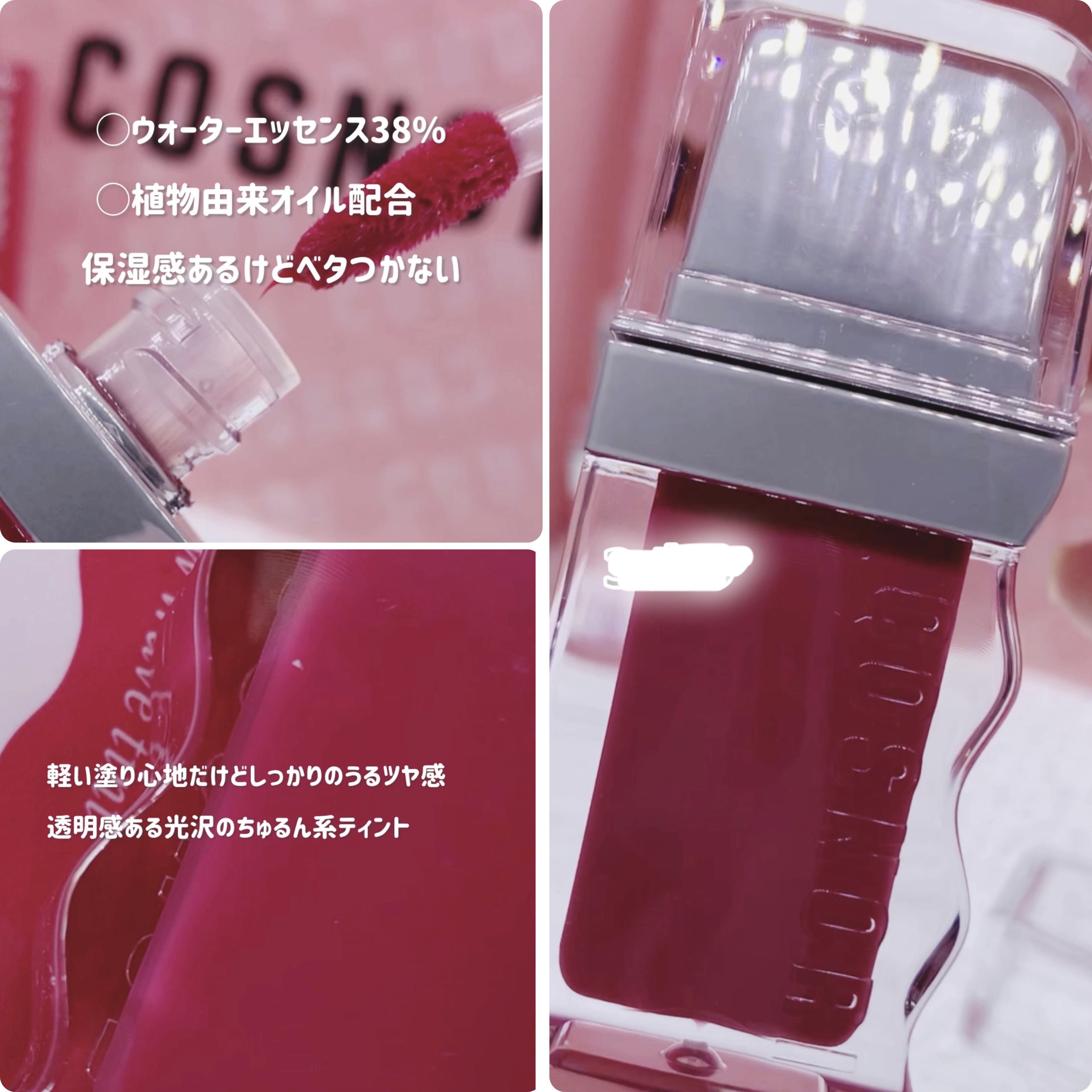 - クリアに満ち溢れる3層ガラス玉光沢がかわいい!コスノリからカラーリップが登場! 軽い付け心地なのにしっかりうるつや・ウォーターエッセンス38%とオイルのこだわりの配合率で、べたつかずに軽いフィッティングでツヤを演出します。 植物由来保湿オイルで唇にやさしい使い心地、しっとりした保湿効果が持続します。 1度塗りでシアーなナチュラルつや感、2.3度重ね塗りをすることで、ガラス玉のようなぽってり*うるツヤ唇へ導きます。 *メイク効果