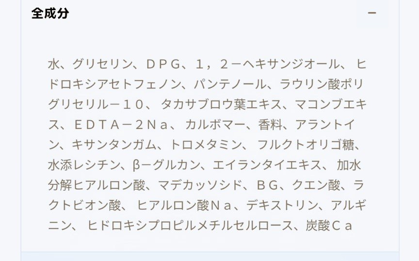 - <PHセンシティブマスクスージング&モイスト> 水、BG、グリセリン、ヒアルロン酸Na、加水分解ヒアルロン酸、キサンタンガム、カルボマー、香料、アルギニン、DPG、水添レシチン、クエン酸、ヒドロキシプロピルメチルセルロース、デキストリン、パンテノール、1,2-ヘキサンジオール、アラントイン、EDTA-2Na、マデカッソシド、ラウリン酸ポリグリセリル-10、トロメタミン、ヒドロキシアセトフェノン、ラクトビオン酸、β-グルカン、炭酸Ca、タカサブロウ葉エキス、フルクトオリゴ糖、エイランタイエキス、コンブエキス