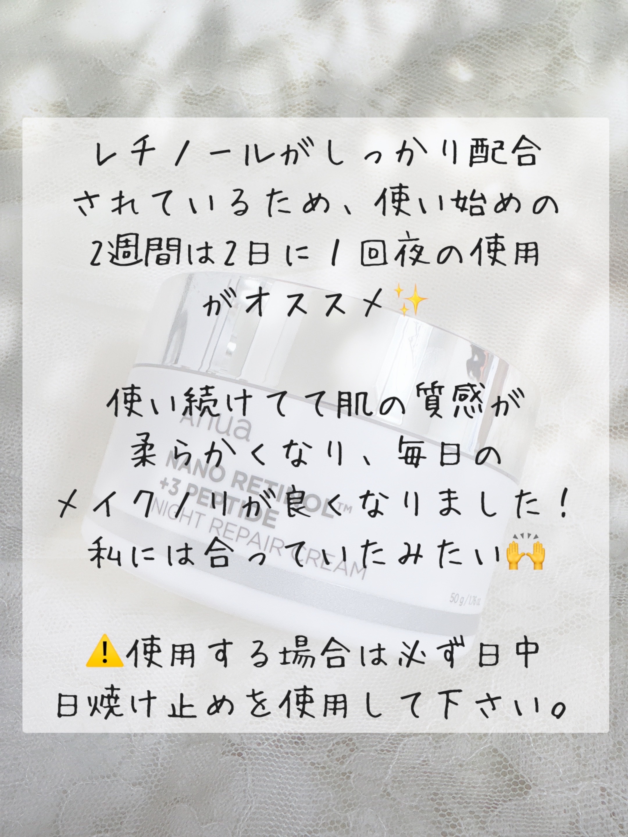 ★1ヶ月使用レビュー★Anuaレチノール3ペプチドナイトリペアクリーム暗い印象の肌を健やかハリケア★Anua独自の技術を採用したAnuaレチノール★やさしい使い心地に導くツボクサエキスをはじめとした整肌成分配合★うるおいを逃さないしっとり保湿...