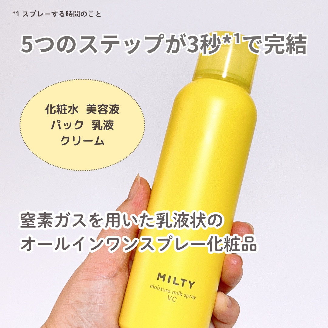 スプレーしてミルクが出てくるのが斬新! この感覚、はじめて🤗 窒素ガスを用いた乳液状のオールインワンスプレー化粧品 ・5つのステップが3秒で完結 超しっとりする。ミストとは思えない保湿力で、スプレー化粧品の常識を覆してるなと思った👏🏻