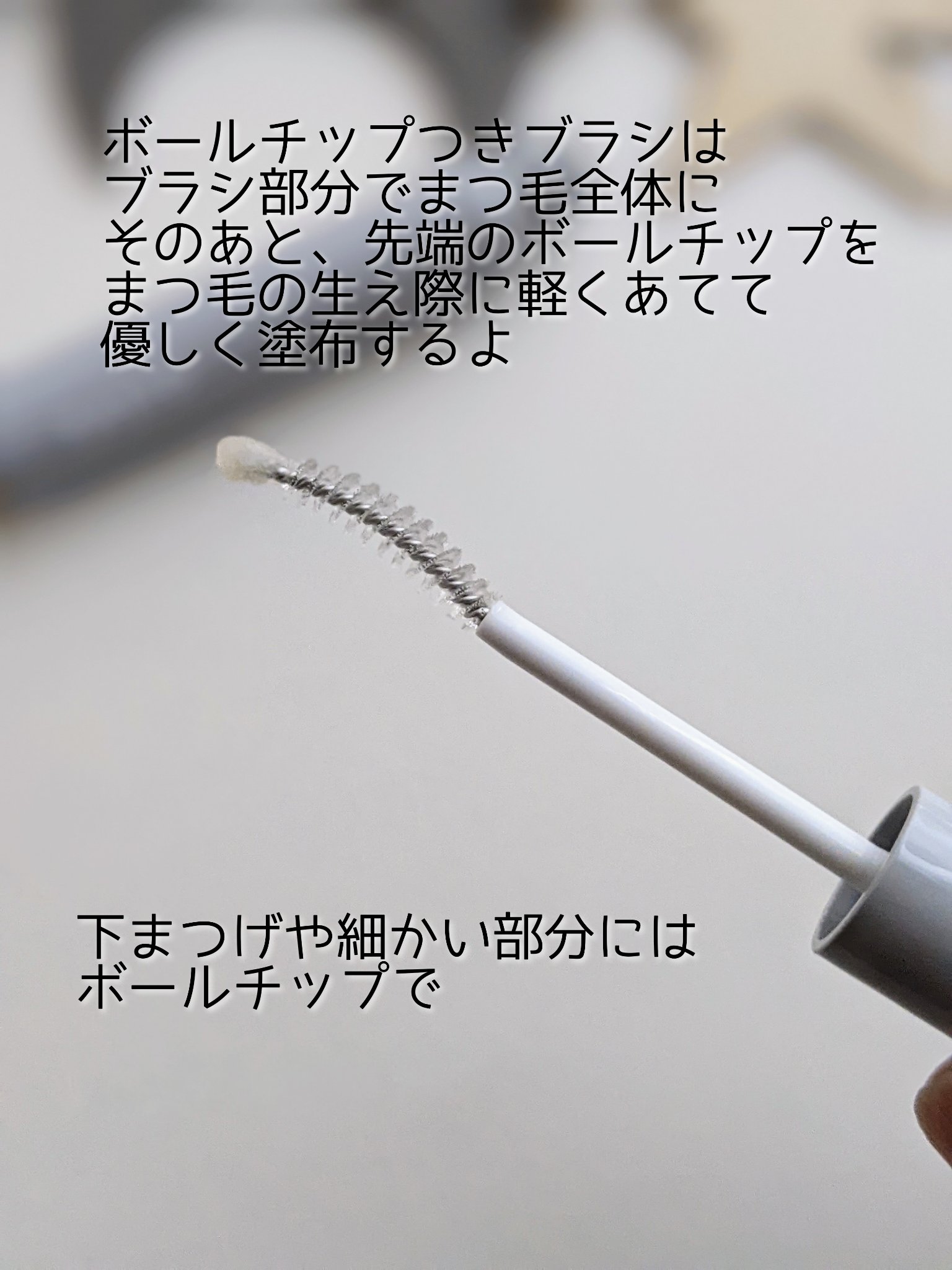 使うたび、もっと濃く、太く🥺 生え際から先端まで保湿・補修し、ハリ・コシアップする即戦力まつ毛美容液! まつ毛補修成分が配合されているので、まつ毛の乾燥やダメージをケアしてくれます💕 先端に肌あたりのよいボールチップがついたカーブブラシを採用。上まつ毛にはブラシ、下まつ毛や生え際などの細かい部分にはボールチップで塗布することで、簡単にまつ毛全体に均ーに塗布できます。