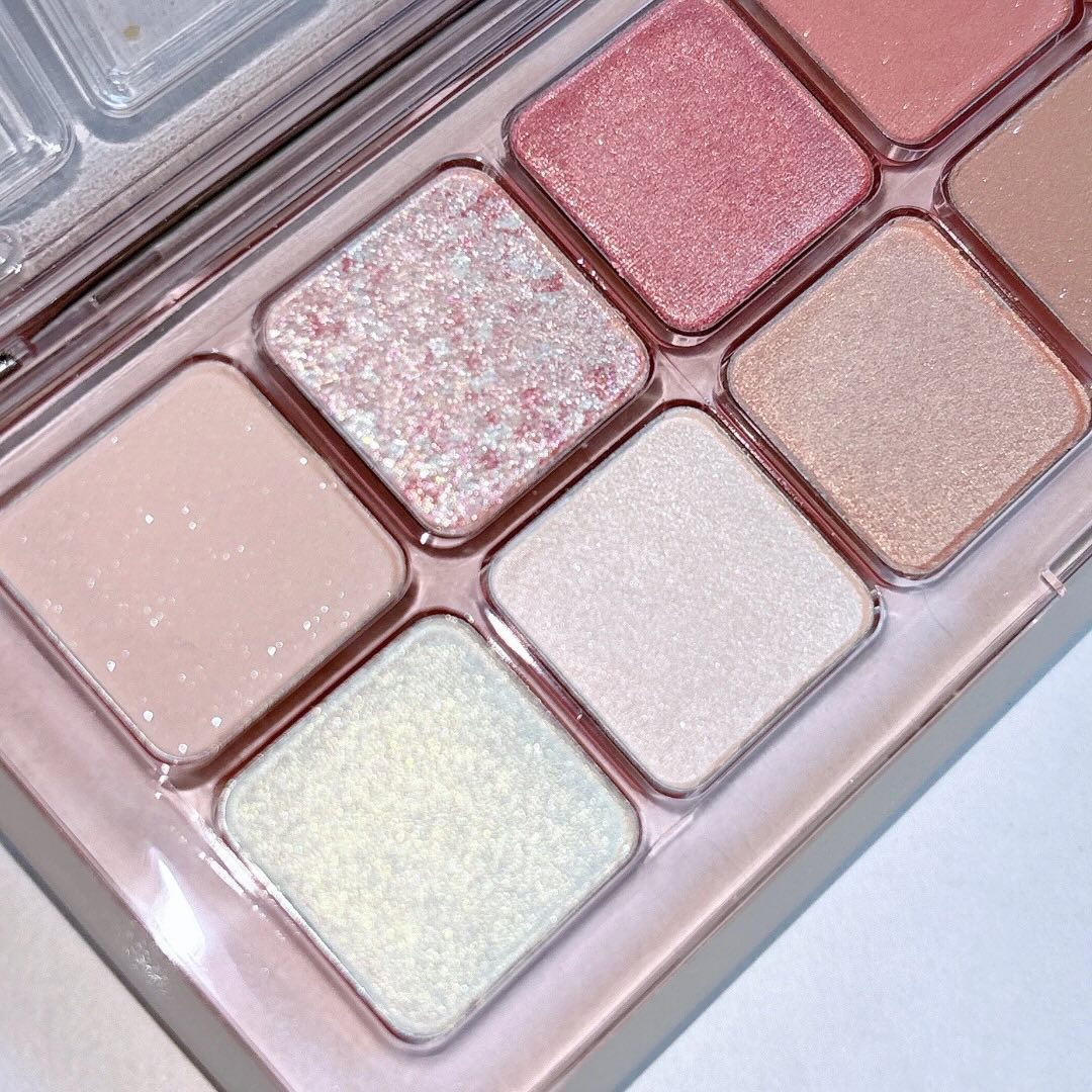 ベース、メイン、締め色、ラメも全部揃っていて、 このパレット一つで色々なメイクができそう! ピンク系のカラーが多く、ピンクメイク好きな方におすすめ🩷🩷 柔らかい発色で使いやすいし、 粉飛びも気になりませんでした💡