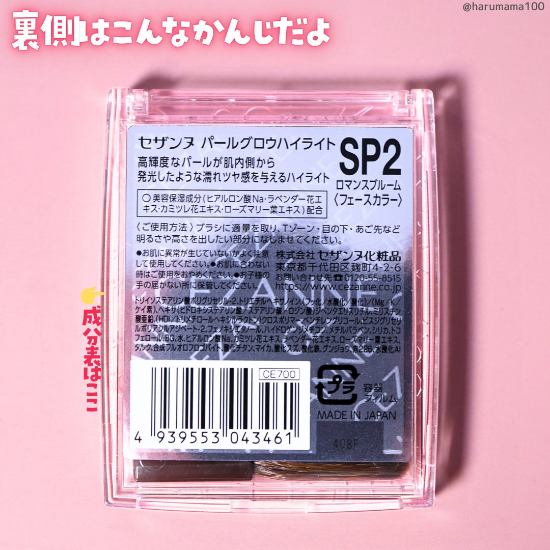 - <SP2 ロマンスブルーム> トリイソステアリン酸ポリグリセリル-2、トリエチルヘキサノイン、(フッ化/水酸化/酸化)/(Mg/K/ケイ素)、ヘキサ(ヒドロキシステアリン酸/ステアリン酸/ロジン酸)ジペンタエリスリチル、ミリスチン酸亜鉛、(HDI/トリメチロールヘキシルラクトン)クロスポリマー、ペンチレングリコール、ビスジグリセリルポリアシルアジペート-2、フェノキシエタノール、ハイドロゲンジメチコン、メチルパラベン、シリカ、トコフェロール、BG、水、ヒアルロン酸Na、カミツレ花エキス、ラベンダー花エキス、ローズマリー葉エキス、タルク、合成フルオロフロゴパイト、酸化チタン、マイカ、酸化スズ、酸化鉄、グンジョウ、赤226、水酸化Al <SP1 オーロラプリズム> トリイソステアリン酸ポリグリセリル-2、トリエチルヘキサノイン、(フッ化/水酸化/酸化)/(Mg/K/ケイ素)、ヘキサ(ヒドロキシステアリン酸/ステアリン酸/ロジン酸)ジペンタエリスリチル、ミリスチン酸亜鉛、(HDI/トリメチロールヘキシルラクトン)クロスポリマー、ペンチレングリコール、ビスジグリセリルポリアシルアジペート-2、フェノキシエタノール、ハイドロゲンジメチコン、メチルパラベン、シリカ、トコフェロール、BG、水、ヒアルロン酸Na、カミツレ花エキス、ラベンダー花エキス、ローズマリー葉エキス、タルク、合成フルオロフロゴパイト、酸化チタン、マイカ、酸化鉄、酸化スズ、マンガンバイオレット、リンゴ酸ジイソステアリル、グンジョウ、水酸化Al