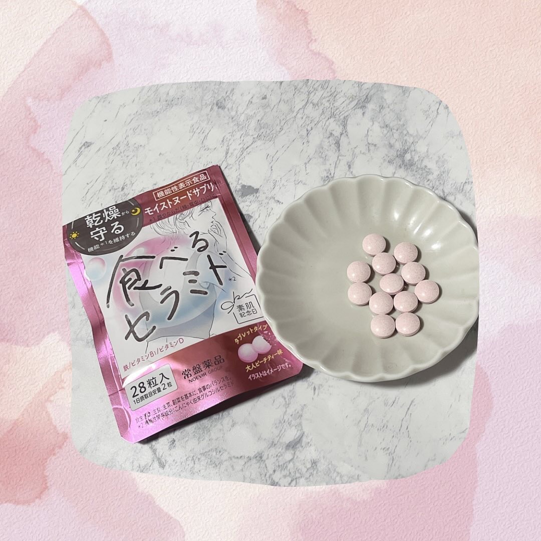 タブレットタイプで美味しく摂取できる『食べるセラミドサプリ』です❣️ こんにゃく由来グルコシルセラミドを配合した機能性表示食品です✨ 甘すぎない優しい大人ピーチティー味で食べやすく美味しく続けや好き風味に🍑🫖