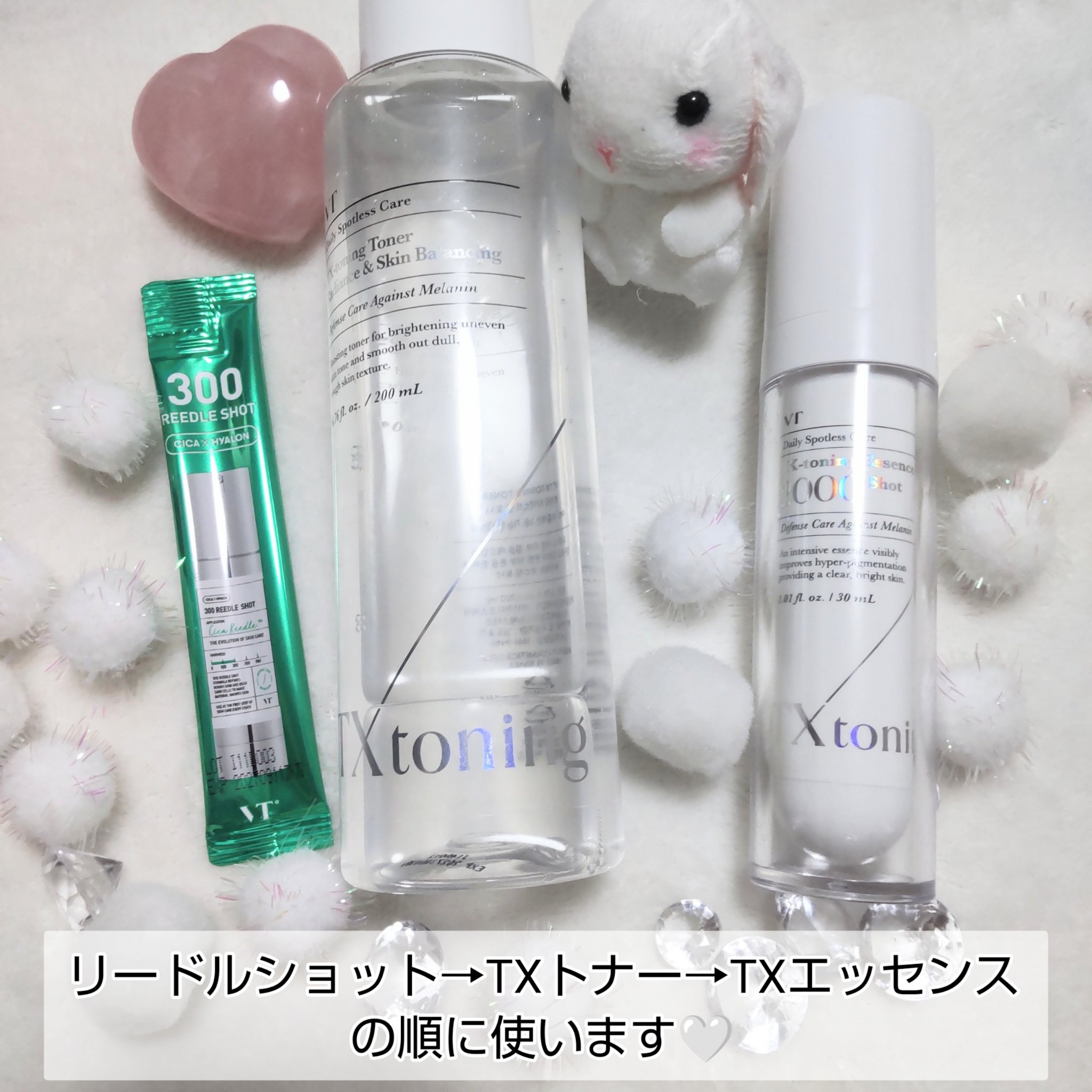 Qoo10で人気のTXトーニングシリーズのトナー🥰使ってみたかったんだよね💗 シャバシャバテクスチャーでスッと馴染んでくれるのに、しっとり潤うような使い心地がすごく好感触! TXトーニングシリーズのメイン成分である「トラネキサム酸」はどんな成分とも併用できるのが◎🙆♀️ 成分の相性気にしなくていいのは助かる✨ベタつかず使いやすい💓 10包入りで旅行にも便利な小分けリードルショット!チクチク🪡
