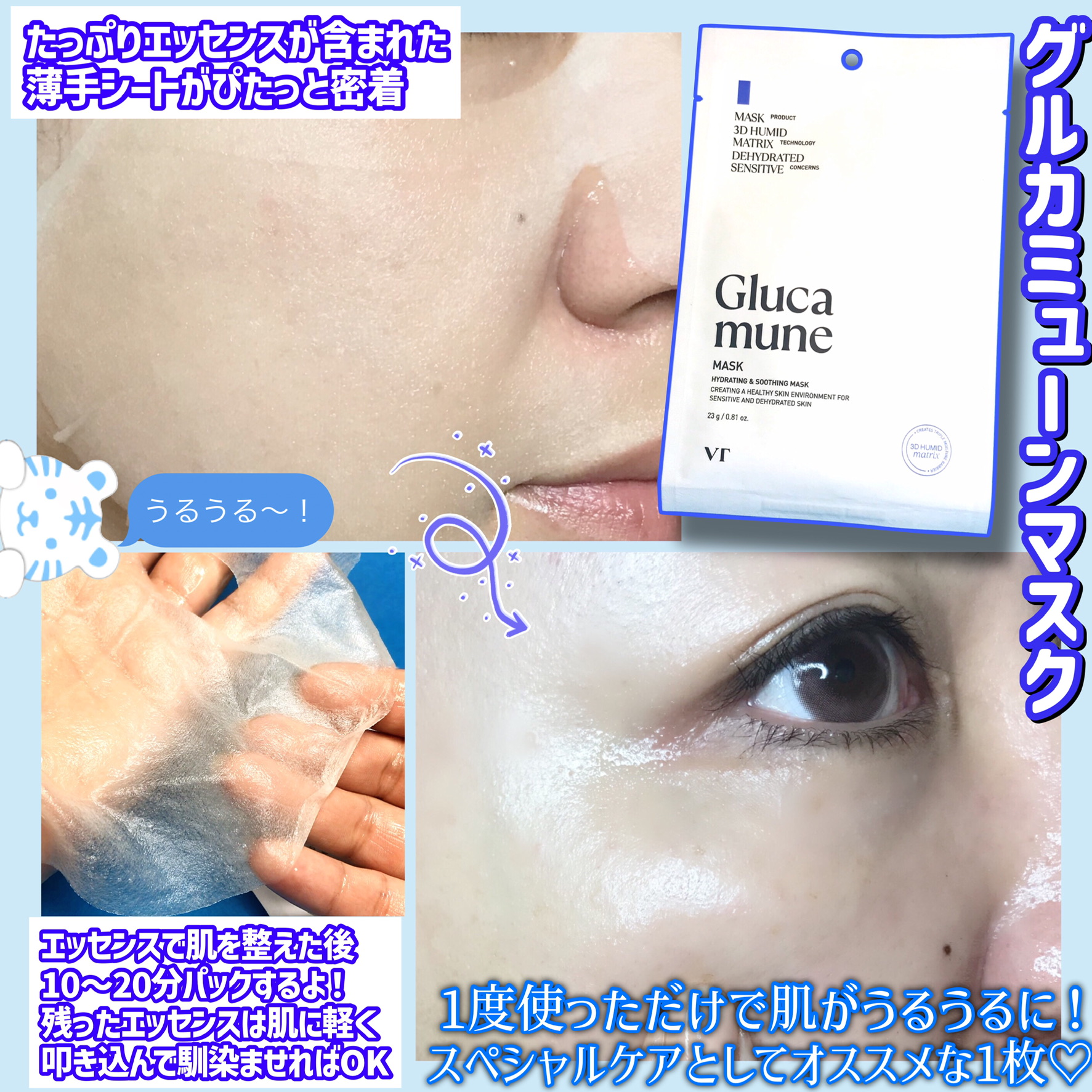 敏感肌・乾燥肌さんにぴったりな新シリーズ"グルカミューン"で水分チャージ𓂃💙 グルカミューンはβグルカン+イミューン(免疫)を表す2つを掛け合わせたシロキクラゲエキス由来のVT独自成分🪄✨ なめらかな肌あたりが気持ちいい🤤 やさしい使い心地でしっとり高保湿。だけど重たくなくてエッセンスが肌に残らない◎すき❤️🔥