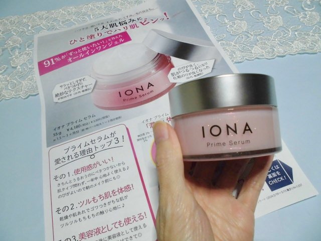 - <イオナ プライム セラム> 水、グリセリン、BG、トリエチルヘキサノイン、トリポリヒドロキシステアリン酸ジペンタエリスリチル、岩石抽出物、グリチルレチン酸ステアリル、グリチルリチン酸2K、スーパーオキシドジスムターゼ、ナイアシンアミド、メリッサ葉エキス、アーチチョーク葉エキス、パルミトイルテトラペプチド-7、パルミトイルトリペプチド-1、セラミド1、セラミド2、セラミド3、セラミド5、セラミド6Ⅱ、ボタンエキス、水溶性コラーゲン、加水分解コラーゲン、ヒアルロン酸Na、加水分解ヒアルロン酸、フィトステロールズ、ペンチレングリコール、トコフェロール、乳酸Na、水添レシチン、クエン酸、クエン酸Na、カルボマー、(アクリレーツ/アクリル酸アルキル(C10-30))クロスポリマー、ステアリン酸PEG-5グリセリル、ポリソルベート20、水酸化K、PVP、HEDTA-3Na、トロメタミン、フェノキシエタノール