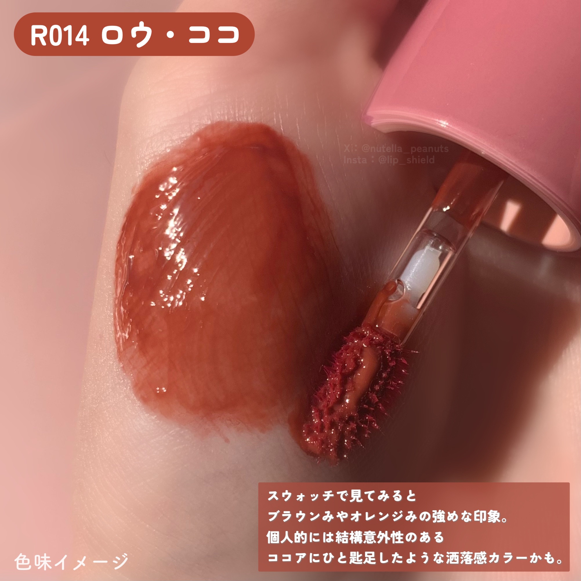 - <R001 ベア> 水、ジフェニルジメチコン、オクチルドデカノール、ビスジグリセリルポリアシルアジペート-2、リンゴ酸ジイソステアリル、トリメチルシロキシフェニルジメチコン、水添ポリイソブテン、ジグリセリン、ポリソルベート60、BG、セチルPEG/PPG-10/1ジメチコン、1,2-ヘキサンジオール、ペンチレングリコール、(アクリル酸ヒドロキシエチル/アクリロイルジメチルタウリンNa)コポリマー、セテアレス-20、スクワラン、フェノキシエタノール、酸化チタン、香料、エチルヘキシルグリセリン、黄5、赤227、イソステアリン酸ソルビタン、水酸化Al、ポリアクリル酸アンモニウム、酢酸トコフェロール、黄4、青1、ヒアルロン酸Na、(アルギニン/リシン)ポリペプチド、加水分解ヒアルロン酸、トコフェロール、アセチルヒアルロン酸Na、ソルビン酸 <R002 ロウローズ> 水、ジフェニルジメチコン、オクチルドデカノール、ビスジグリセリルポリアシルアジペート-2、リンゴ酸ジイソステアリル、トリメチルシロキシフェニルジメチコン、水添ポリイソブテン、ジグリセリン、ポリソルベート60、BG、セチルPEG/PPG-10/1ジメチコン、1,2-ヘキサンジオール、ペンチレングリコール、(アクリル酸ヒドロキシエチル/アクリロイルジメチルタウリンNa)コポリマー、セテアレス-20、スクワラン、フェノキシエタノール、酸化チタン、香料、エチルヘキシルグリセリン、黄5、赤227、イソステアリン酸ソルビタン、酢酸トコフェロール、水酸化Al、ポリアクリル酸アンモニウム、ヒアルロン酸Na、青1、加水分解ヒアルロン酸、(アルギニン/リシン)ポリペプチド、トコフェロール、アセチルヒアルロン酸Na、ソルビン酸 <R003 ロウプリコット> 水、ジフェニルジメチコン、オクチルドデカノール、ビスジグリセリルポリアシルアジペート-2、リンゴ酸ジイソステアリル、トリメチルシロキシフェニルジメチコン、水添ポリイソブテン、ジグリセリン、ポリソルベート60、BG、セチルPEG/PPG-10/1ジメチコン、1,2-ヘキサンジオール、ペンチレングリコール、(アクリル酸ヒドロキシエチル/アクリロイルジメチルタウリンNa)コポリマー、セテアレス-20、スクワラン、フェノキシエタノール、香料、エチルヘキシルグリセリン、酸化チタン、黄5、イソステアリン酸ソルビタン、赤227、酢酸トコフェロール、ヒアルロン酸Na、水酸化Al、ポリアクリル酸アンモニウム、加水分解ヒアルロン酸、青1、(アルギニン/リシン)ポリペプチド、トコフェロール、アセチルヒアルロン酸Na、ソルビン酸 <R004 フィーバー> 水、ジフェニルジメチコン、オクチルドデカノール、リンゴ酸ジイソステアリル、ビスジグリセリルポリアシルアジペート-2、トリメチルシロキシフェニルジメチコン、水添ポリイソブテン、ジグリセリン、ポリソルベート60、BG、セチルPEG/PPG-10/1ジメチコン、1,2-ヘキサンジオール、ペンチレングリコール、(アクリル酸ヒドロキシエチル/アクリロイルジメチルタウリンNa)コポリマー、セテアレス-20、スクワラン、フェノキシエタノール、香料、エチルヘキシルグリセリン、黄5、赤227、イソステアリン酸ソルビタン、酢酸トコフェロール、ヒアルロン酸Na、加水分解ヒアルロン酸、(アルギニン/リシン)ポリペプチド、トコフェロール、アセチルヒアルロン酸Na、ソルビン酸 <R005 ハイビスカス> 水、ジフェニルジメチコン、オクチルドデカノール、ビスジグリセリルポリアシルアジペート-2、リンゴ酸ジイソステアリル、トリメチルシロキシフェニルジメチコン、水添ポリイソブテン、ジグリセリン、ポリソルベート60、BG、セチルPEG/PPG-10/1ジメチコン、1,2-ヘキサンジオール、ペンチレングリコール、アクリル酸ヒドロキシエチル/アクリロイルジメチルタウリンNa)コポリマー、セテアレス-20、スクワラン、フェノキシエタノール、香料、エチルヘキシルグリセリン、赤227、黄5、イソステアリン酸ソルビタン、赤104(1)、酢酸トコフェロール、ヒアルロン酸Na、加水分解ヒアルロン酸、(アルギニン/リシン)ポリペプチド、トコフェロール、アセチルヒアルロン酸Na、ソルビン酸 <R006 ロウグレープ> 水、ジフェニルジメチコン、ビスジグリセリルポリアシルアジペート-2、リンゴ酸ジイソステアリル、オクチルドデカノール、トリメチルシロキシフェニルジメチコン、水添ポリイソブテン、ジグリセリン、ポリソルベート60、BG、セチルPEG/PPG-10/1ジメチコン、1,2-ヘキサンジオール、ペンチレングリコール、(アクリル酸ヒドロキシエチル/アクリロイルジメチルタウリンNa)コポリマー、セテアレス-20、スクワラン、酸化チタン、フェノキシエタノール、香料、エチルヘキシルグリセリン、黄5、赤227、イソステアリン酸ソルビタン、水酸化Al、ポリアクリル酸アンモニウム、酢酸トコフェロール、ヒアルロン酸Na、青1、加水分解ヒアルロン酸、(アルギニン/リシン)ポリペプチド、トコフェロール、アセチルヒアルロン酸Na、ソルビン酸 <R007 チル> 水、ジフェニルジメチコン、オクチルドデカノール、ビスジ