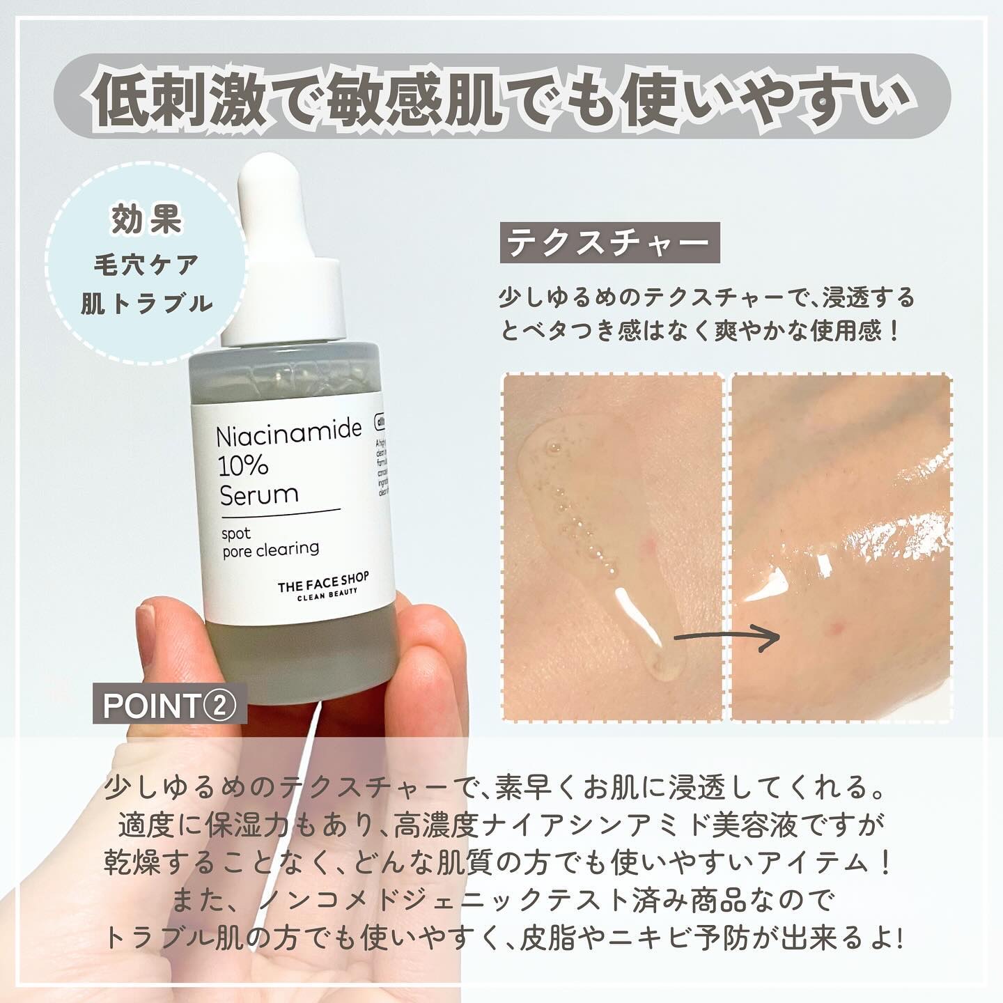 3大の毛穴トラブル*をしっかりケア!! 毛穴・弾力・キメを同時にケアできる。 ナイアシンアミド10%とカフェイン、アデノシン入りのフォーミュラが敏感肌と乾燥肌、肌荒れや毛穴などの肌トラブルをケアしてくれる✨ ほんのり黄色の少しとろみあるテクスチャー♫ でも馴染ませるとサラっとしてます😊