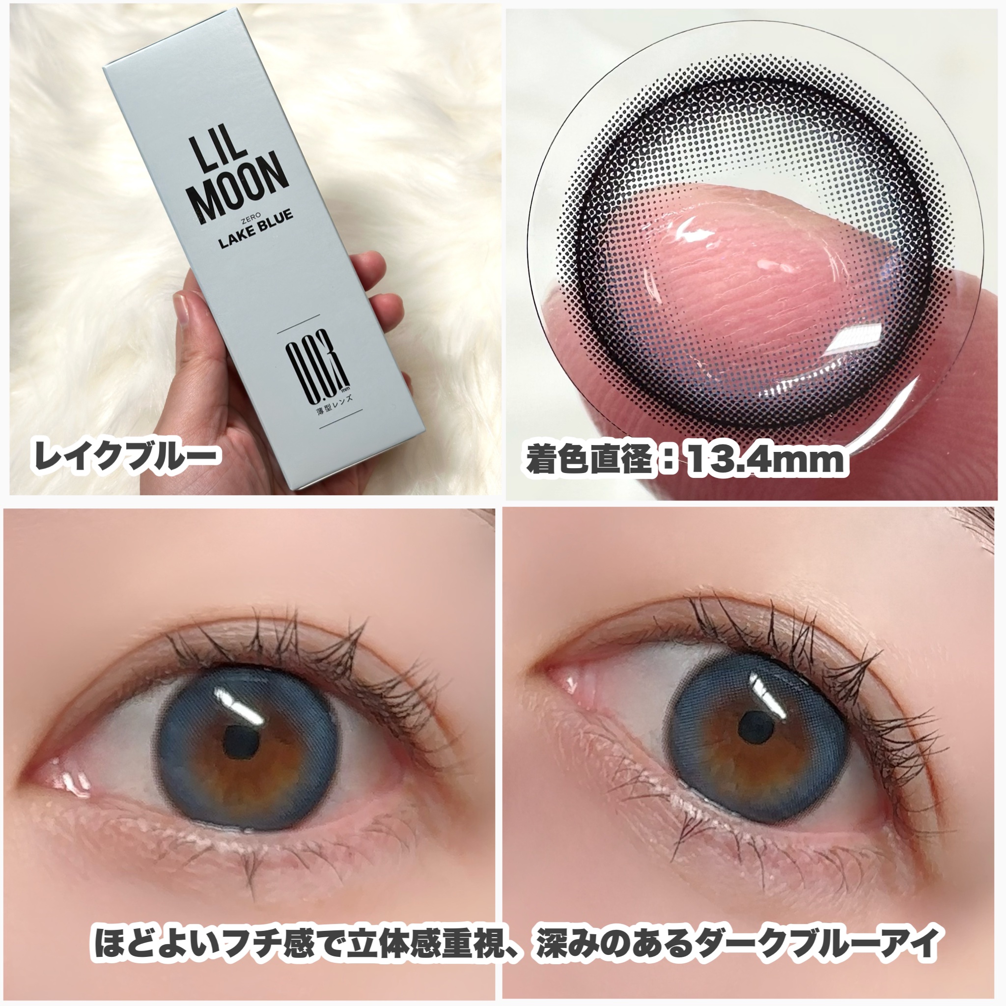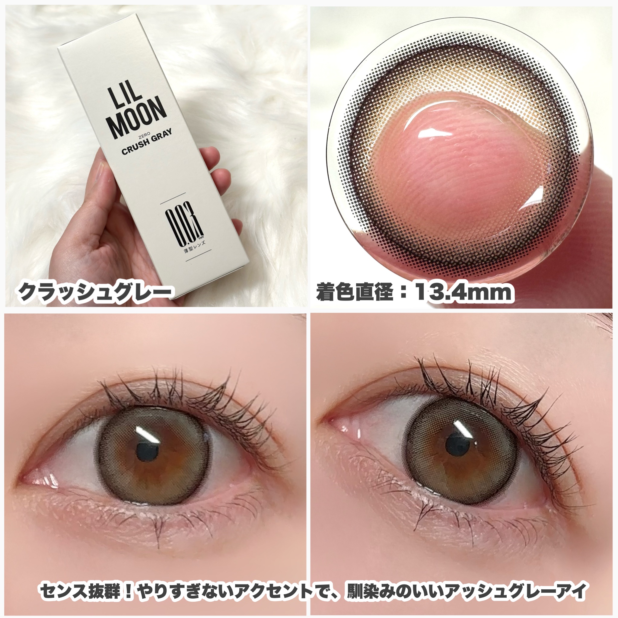 - "ZERO”感つけ心地、きらめきUP! (1)全度数0.03mm極薄*1*2 LILMOON(リルムーン)「0.03シリーズ」は、全度数レンズの中心厚が0.03㎜で、レンズが薄く厚みが少ない分、まるで裸眼のような快適な付け心地で異物感を感じにくいです。 (2) 全度数酸素透過率DK/t:45 『LIL MOON(リルムーン)』0.03シリーズは全度数レンズの酸素透過率DK/t:45、従来の含水率38%通常厚レンズと比べ2倍以上*2の酸素透過率を実現し、酸素不足による充血を軽減。高い保水力を持つMPCポリマーを保存液に配合し、乾燥や目のゴロゴロ感を軽減。 (3)気分で選べるクリアレンズとカラーレンズ 多彩な瞳も、自然な瞳も,カラコンとクリアレンズ、どちらも揃う。カラコンお試しサイズ2枚入りを用意、気軽にお試しできちゃう。幅広いラインナップで、瞳に自信と輝きをプラス、毎日のスタイルを自由に楽しめる! <クラッシュグレー> センス◎!やりすぎないアクセントで、馴染みのいいアッシュグレーアイ <サンセットコーヒー> ちゅるんと透明感UP演出! 落ち着いた水光ブラウンアイ <ジェントルピンク> クリっと瞳を際立たせるふんわり太フチと、 優しいほんのりピンクアイ <ゼロインク> ダークウッドをイメージしたブラックレンズ、透明感あふれるクリっとした瞳 <ゼロヘーゼル> 大人っぽいブラウンに差し込む ヘーゼルカラー、オシャレなブラウンアイ <ゼロチャコール> 落ち着いたダークグレーにブルー でアクセント、クールな大人アイ <レイクブルー> ほどよいフチ感で立体感見え重視、深みのあるダークブルーアイ *1:使用感には個人差があります *2:当社製品比較 カラーコンタクトレンズの不適正使用による眼障害の危険性等などがあります。 ●コンタクトレンズは高度管理医療機器です。不十分な洗浄・消毒など不適切なケアや、長時間・交換期間を超えた装用により、アレルギー性結膜炎、角膜感染症、角膜潰瘍等の重篤な眼障害が発生する危険性があります ●ご使用前に取扱説明書を確認してください 使用上の留意事項 ●眼科医院等を受診してからお求めください ●眼に異常を感じたら直ちにレンズ使用を中止し、お近くの眼科等で診察を受けてください ●医師の指示にしたがってご使用ください ●コンタクトレンズを装用する場合、自覚症状がなくても、眼科医院等での定期検査を受けてください ●レンズに不具合がある場合は使用しないでください