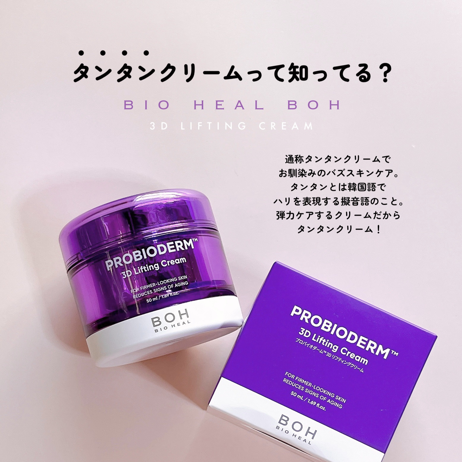 - プロバイオダーム™ 3D リフティングクリーム ・既存のタンタンクリームが、より一層のハリ弾力ケアができる商品としてパワーアップ※! ★プロバイオダーム™ 3Dリフティングクリームリニューアルポイント★ ①BIOHEAL BOHが厳選した乳酸菌*のみ配合した独自保湿成分!「プロバイオダーム™」 BIOHEAL BOHの厳しい審査のもとに選び抜かれた肌バリアをサポートする独自の乳酸菌*でハリ弾力ケアを! →キーワード #ハリ活乳酸菌 *厳選した乳酸菌:ラクトバチルスプランタラム&ラクトバチルスラムノサス&ラクトバチルスロイテリ(全て保湿) ②肌本来の弾力維持に欠かせない成分をプラス!肌が持つ成分を補うことで、ふっくらうるおった肌のハリ感をキープ ③ペプチドが12種から17種に!肌バリアを形成。素肌をすこやかに保ちます。 ・もちっと密度の高いクリームで保湿&ハリケア。 バイオヒールボ独自の技術で肌表面をピンとハリをあたえ、よりハリ感が得られるテクスチャーを実現 ・3Dと訴求しているように、ふっくらうるおい感のある多面的な弾力ケアができることから、韓国語でしっかりハリのある様子を表現するタンタン(탄탄)のワードと組み合わせて「3Dタンタンシクリーム」という愛称ができました。 ・もちっと密度の高いクリームで弾力のある素肌に導くエイジングケア※2クリーム。 ※同商品リニューアル前に比べて ※2年齢に応じたケアの事