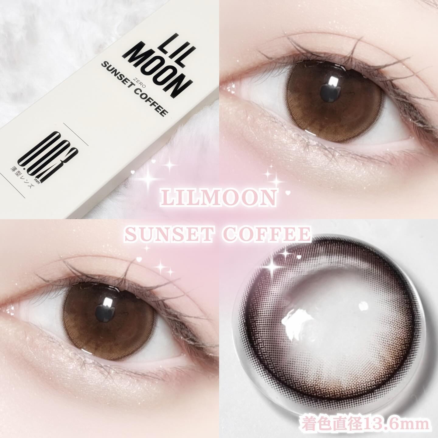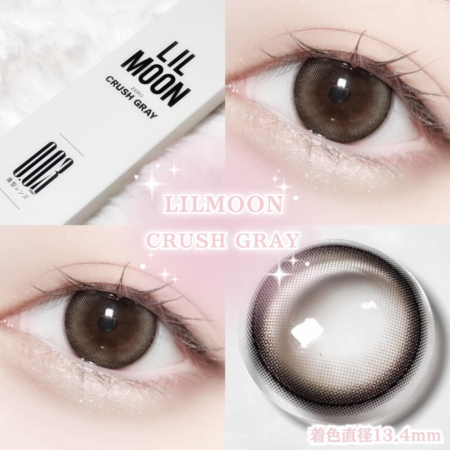 - "ZERO”感つけ心地、きらめきUP! (1)全度数0.03mm極薄*1*2 LILMOON(リルムーン)「0.03シリーズ」は、全度数レンズの中心厚が0.03㎜で、レンズが薄く厚みが少ない分、まるで裸眼のような快適な付け心地で異物感を感じにくいです。 (2) 全度数酸素透過率DK/t:45 『LIL MOON(リルムーン)』0.03シリーズは全度数レンズの酸素透過率DK/t:45、従来の含水率38%通常厚レンズと比べ2倍以上*2の酸素透過率を実現し、酸素不足による充血を軽減。高い保水力を持つMPCポリマーを保存液に配合し、乾燥や目のゴロゴロ感を軽減。 (3)気分で選べるクリアレンズとカラーレンズ 多彩な瞳も、自然な瞳も,カラコンとクリアレンズ、どちらも揃う。カラコンお試しサイズ2枚入りを用意、気軽にお試しできちゃう。幅広いラインナップで、瞳に自信と輝きをプラス、毎日のスタイルを自由に楽しめる! <クラッシュグレー> センス◎!やりすぎないアクセントで、馴染みのいいアッシュグレーアイ <サンセットコーヒー> ちゅるんと透明感UP演出! 落ち着いた水光ブラウンアイ <ジェントルピンク> クリっと瞳を際立たせるふんわり太フチと、 優しいほんのりピンクアイ <ゼロインク> ダークウッドをイメージしたブラックレンズ、透明感あふれるクリっとした瞳 <ゼロヘーゼル> 大人っぽいブラウンに差し込む ヘーゼルカラー、オシャレなブラウンアイ <ゼロチャコール> 落ち着いたダークグレーにブルー でアクセント、クールな大人アイ <レイクブルー> ほどよいフチ感で立体感見え重視、深みのあるダークブルーアイ *1:使用感には個人差があります *2:当社製品比較 カラーコンタクトレンズの不適正使用による眼障害の危険性等などがあります。 ●コンタクトレンズは高度管理医療機器です。不十分な洗浄・消毒など不適切なケアや、長時間・交換期間を超えた装用により、アレルギー性結膜炎、角膜感染症、角膜潰瘍等の重篤な眼障害が発生する危険性があります ●ご使用前に取扱説明書を確認してください 使用上の留意事項 ●眼科医院等を受診してからお求めください ●眼に異常を感じたら直ちにレンズ使用を中止し、お近くの眼科等で診察を受けてください ●医師の指示にしたがってご使用ください ●コンタクトレンズを装用する場合、自覚症状がなくても、眼科医院等での定期検査を受けてください ●レンズに不具合がある場合は使用しないでください