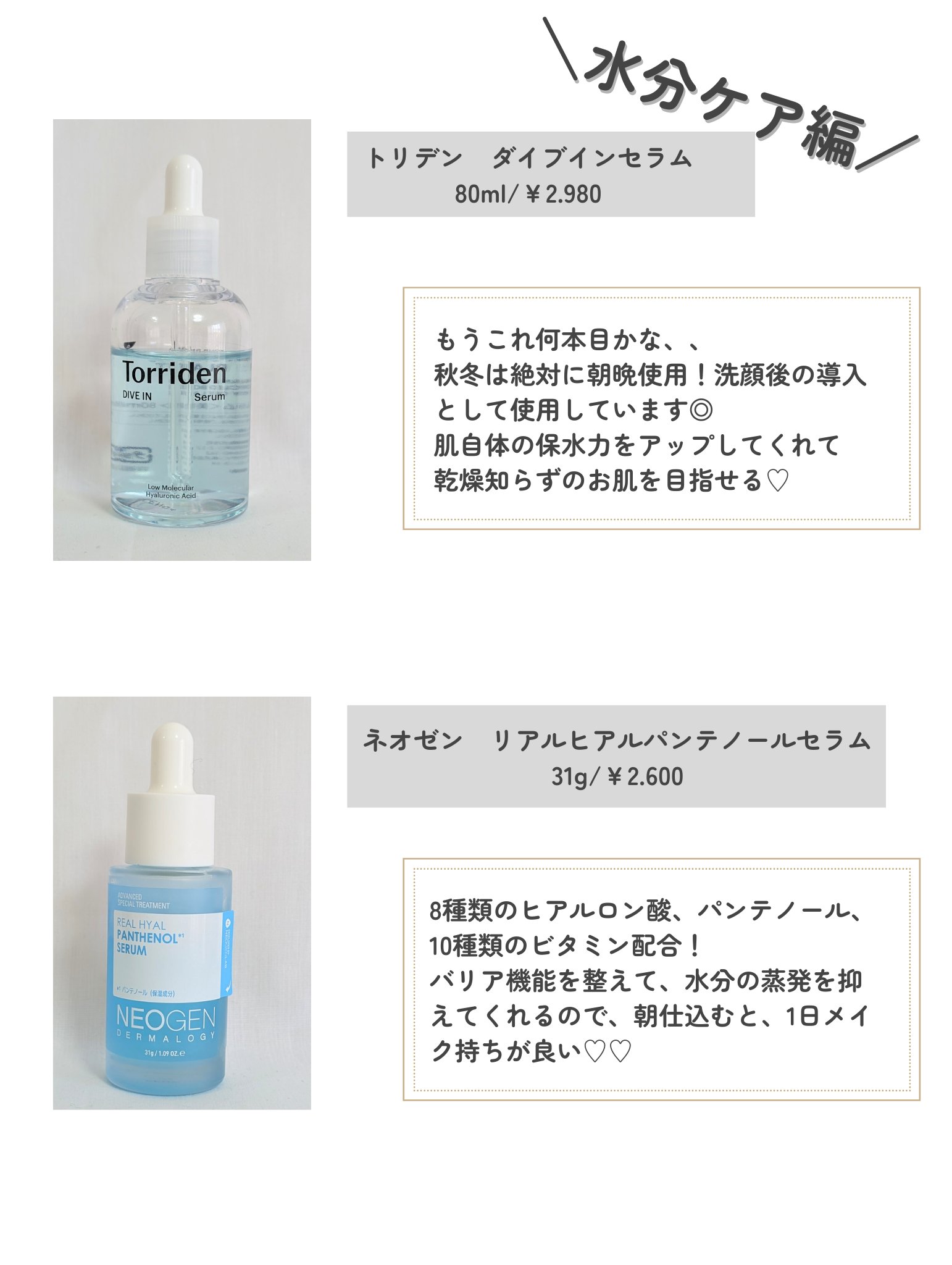 使用感がよくて引き続き、春夏も使用したいと思います! 赤みの鎮静や、LHAでごわつきケアも◎ どんなアイテムとも相性がいいのでとても使いやすい 保湿は美肌の第一歩として絶対に欠かせないので、ダイブイン セラムはこれからも使用すると思うし、バランスフル シカセラムはゆらぎ肌や鎮静させたいときに刺激なく使いやすいので、これから活躍してくれると思います🫧 保湿力が高いのはもちろん、保水持続力も実感できるので頼れる存在です🤍