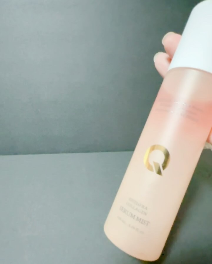 NUDIQUEのコラーゲンセラムミスト🧡 コラーゲンやヒト幹細胞培養液がはいってる! ベタつかずにツヤっぽい潤い肌になれる〜! メイク前にも◎ ラベンダーオイル配合で香りもいい香り🪻