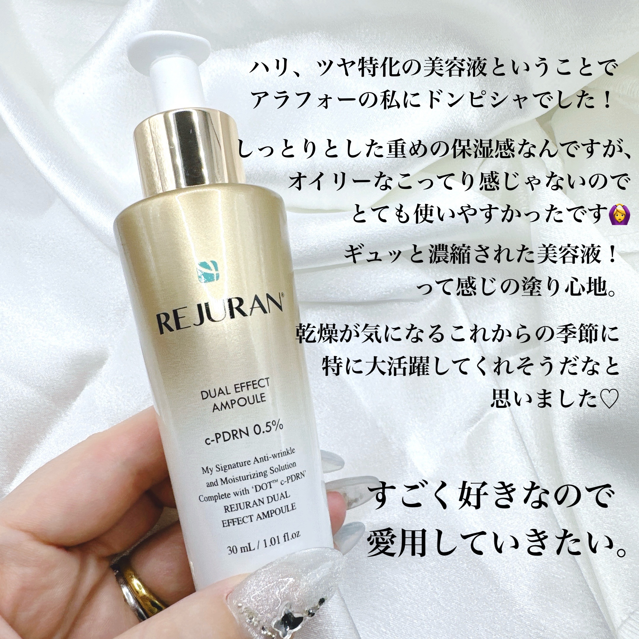 ファーマリサーチ社から誕生したダーマコスメブランドリジュラン✨️ 今回紹介するデュアル エフェクト アンプルは、独自技術DOT c-PDRNにセラミドまで配合された、アンチエイジングに特化したアンプルなんだ! しっとりもちもちになる、保湿力高めな使用感がお気に入り♪ わたしは、ナイトスキンケアとして取り入れた翌朝のお肌に、めっちゃ効果を感じたよ😳 この乾燥シーズンにも負けないくらい、お肌が艶っとしてくれてるの🫧 さすがSNSで話題になってるだけあるね🥹