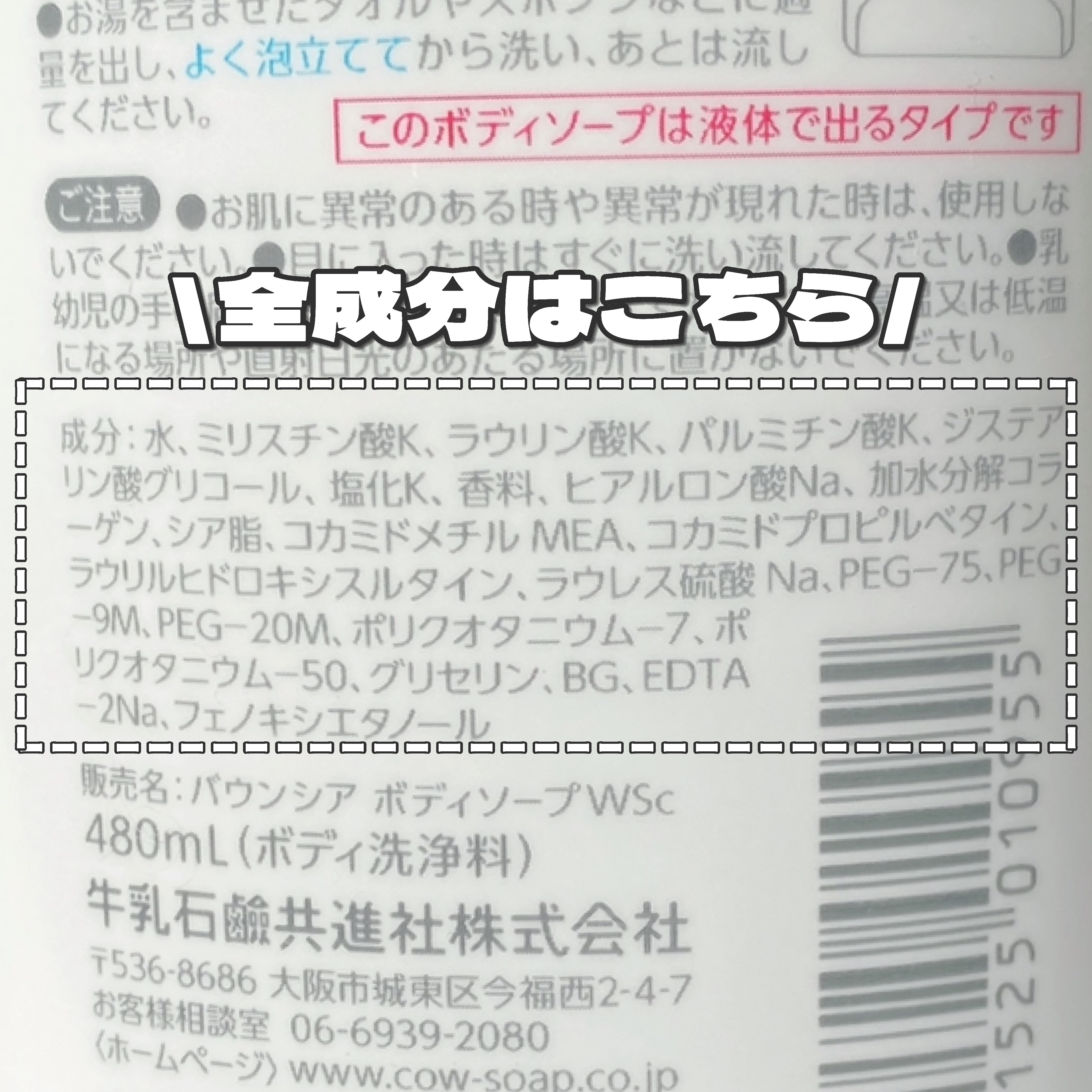 - <ポンプ付 480ml> 水、ミリスチン酸、ラウリン酸、パルミチン酸、水酸化K、ジステアリン酸グリコール、塩化K、香料、ヒアルロン酸Na、加水分解コラーゲン、シア脂、コカミドMEA、コカミドプロピルベタイン、ラウリルヒドロキシスルタイン、ラウレス硫酸Na、PEG-75、PEG-9M、PEG-20M、PEG-115M、ポリクオタニウム-7、ポリクオタニウム-50、ステアリン酸、グリセリン、EDTA-2Na <詰替え用 360ml> 水、ミリスチン酸、ラウリン酸、パルミチン酸、水酸化K、ジステアリン酸グリコール、塩化K、香料、ヒアルロン酸Na、加水分解コラーゲン、シア脂、コカミドMEA、コカミドプロピルベタイン、ラウリルヒドロキシスルタイン、ラウレス硫酸Na、PEG-75、PEG-9M、PEG-20M、PEG-115M、ポリクオタニウム-7、ポリクオタニウム-50、ステアリン酸、グリセリン、EDTA-2Na <詰替用 1120ml> 水、ミリスチン酸、ラウリン酸、パルミチン酸、水酸化K、ジステアリン酸グリコール、塩化K、香料、ヒアルロン酸Na、加水分解コラーゲン、シア脂、コカミドMEA、コカミドプロピルベタイン、ラウリルヒドロキシスルタイン、ラウレス硫酸Na、PEG-75、PEG-9M、PEG-20M、PEG-115M、ポリクオタニウム-7、ポリクオタニウム-50、ステアリン酸、グリセリン、EDTA-2Na <ポンプ付 360ml> 水、ミリスチン酸、ラウリン酸、パルミチン酸、水酸化K、ジステアリン酸グリコール、塩化K、香料、ヒアルロン酸Na、加水分解コラーゲン、シア脂、コカミドMEA、コカミドプロピルベタイン、ラウリルヒドロキシスルタイン、ラウレス硫酸Na、PEG-75、PEG-9M、PEG-20M、PEG-115M、ポリクオタニウム-7、ポリクオタニウム-50、ステアリン酸、グリセリン、EDTA-2Na <お試し品 360mL> 水、ミリスチン酸、ラウリン酸、パルミチン酸、水酸化K、ジステアリン酸グリコール、塩化K、香料、ヒアルロン酸Na、加水分解コラーゲン、シア脂、コカミドMEA、コカミドプロピルベタイン、ラウリルヒドロキシスルタイン、ラウレス硫酸Na、PEG-75、PEG-9M、PEG-20M、PEG-115M、ポリクオタニウム-7、ポリクオタニウム-50、ステアリン酸、グリセリン、EDTA-2Na <詰替え用 1240ml> 水、ミリスチン酸、ラウリン酸、パルミチン酸、水酸化K、ジステアリン酸グリコール、塩化K、香料、ヒアルロン酸Na、加水分解コラーゲン、シア脂、コカミドMEA、コカミドプロピルベタイン、ラウリルヒドロキシスルタイン、ラウレス硫酸Na、PEG-75、PEG-9M、PEG-20M、PEG-115M、ポリクオタニウム-7、ポリクオタニウム-50、ステアリン酸、グリセリン、EDTA-2Na <お試し本体> 水、ミリスチン酸、ラウリン酸、パルミチン酸、水酸化K、ジステアリン酸グリコール、塩化K、香料、ヒアルロン酸Na、加水分解コラーゲン、シア脂、コカミドMEA、コカミドプロピルベタイン、ラウリルヒドロキシスルタイン、ラウレス硫酸Na、PEG-75、PEG-9M、PEG-20M、PEG-115M、ポリクオタニウム-7、ポリクオタニウム-50、ステアリン酸、グリセリン、EDTA-2Na