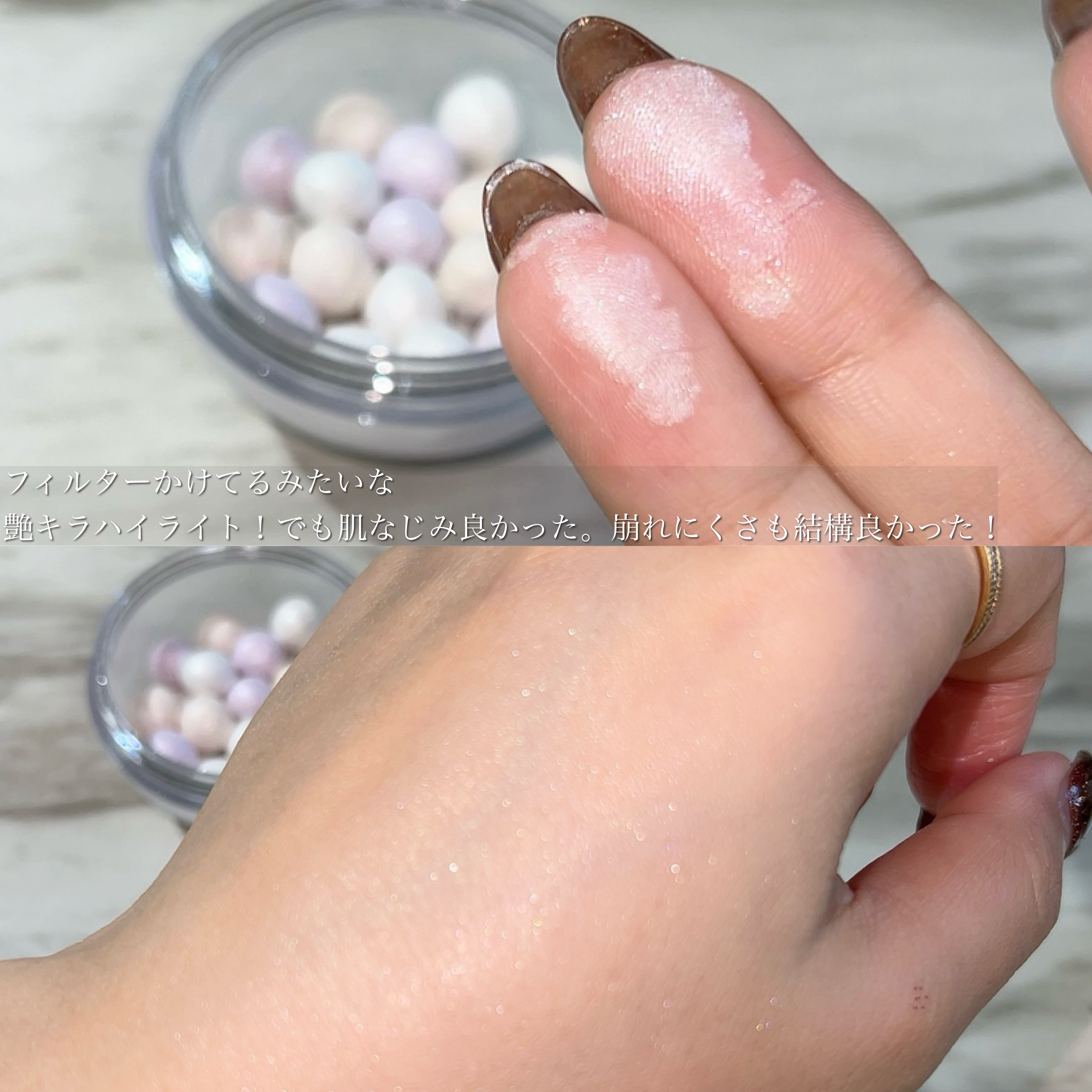 - ※揺れや衝撃に弱い商品です。 配送過程で玉の形が崩れたり容器内部にパウダーが付着する場合がございますので、ご購入の際はあらかじめご了承ください。 尚、使用には問題ございませんので、安心してご使用ください。 パウダーなので、油分をしっかり抑えてくれて肌のキメを整える。 繊細なパールが輝いてくれて、ハイライト効果◎。 ツヤやかで肌馴染みのよい3色のシアカラーで構成されていてナチュラルに発色。 (2024年10月12日より全国のロフトにて(一部店舗を除く)にて数量限定発売)