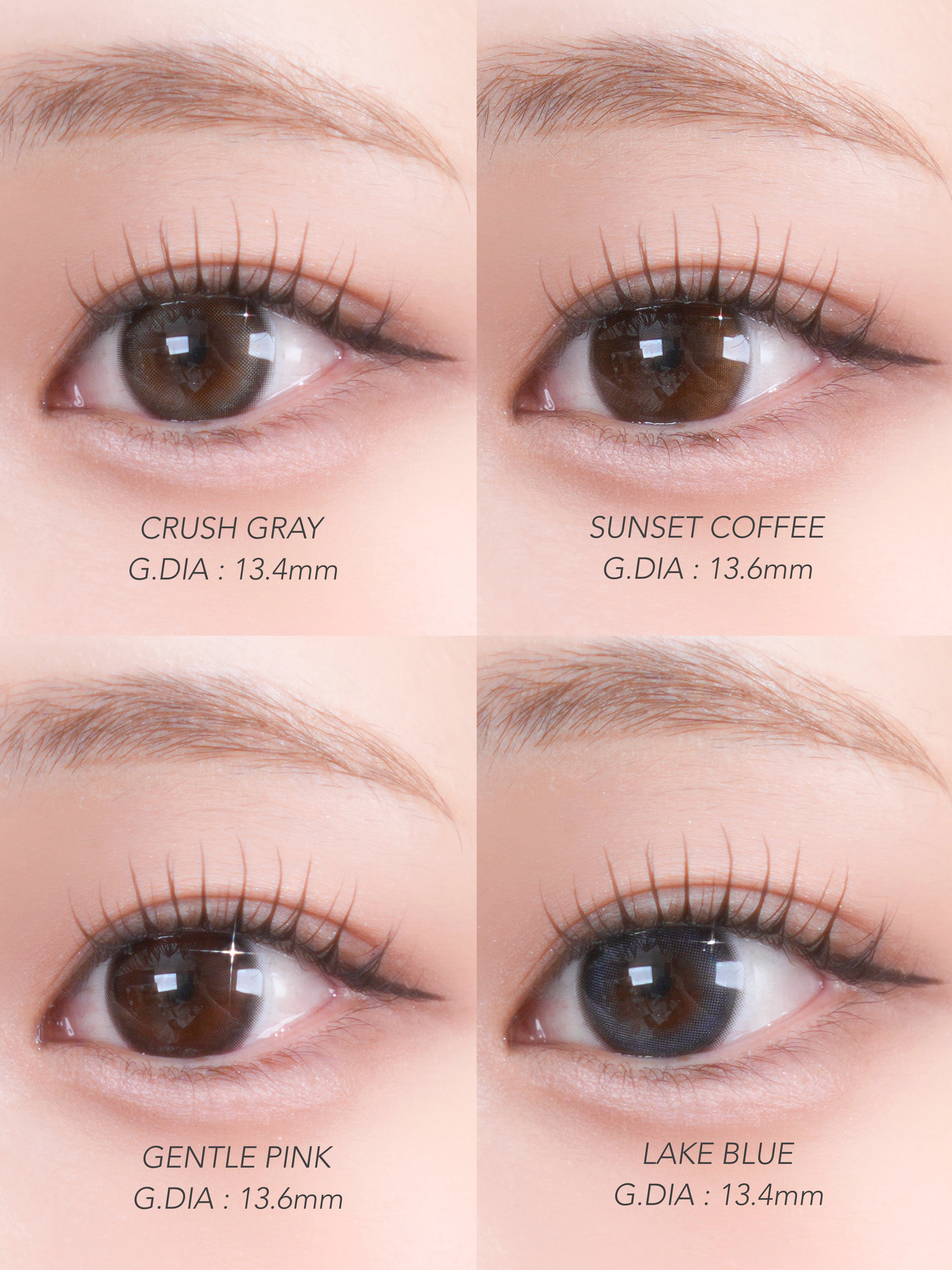 一番フチが太めだけど、ふわっとしたデザインなので きつい印象にならない! グレーみはしっかり感じることができる🩶 フチが細くてくっきりしてる! ガラス玉みたいにくりっとした印象に✨ 瞳の印象をはっきりさせたい人におすすめ 着色直径は一番小さめだけどくりっと見える! 比較すると、ベージュも混ざったような色に見えて グレージュカラーに近いイメージ♡