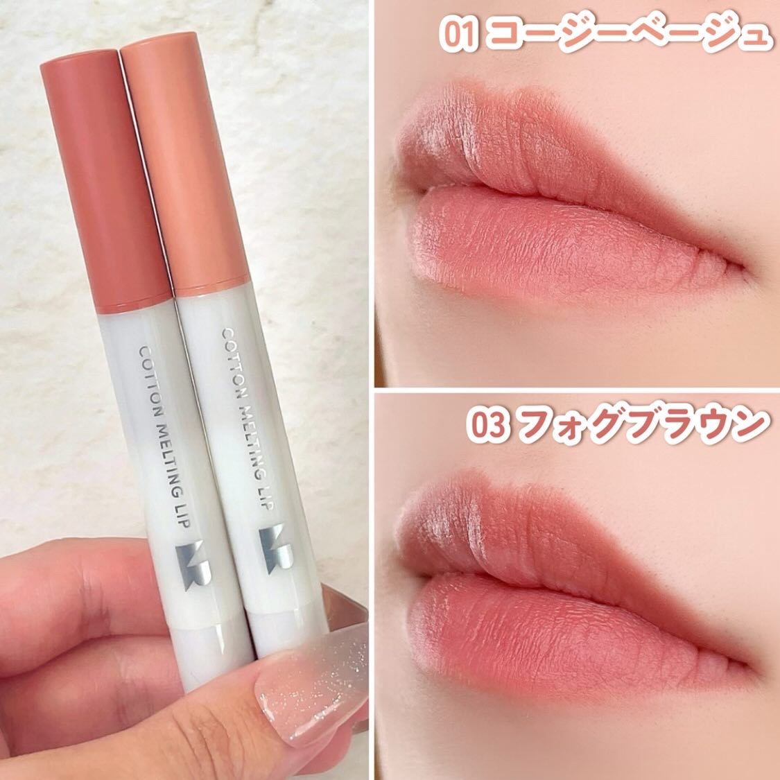 - ふんわりマシュマロ唇が作れちゃう「コットンメルティングリップ」が登場! シアバターと8種のヒアルロン酸配合で、マットリップなのに軽やかにうるおう新概念リップです。 イエベ・ブルべ問わず肌馴染みのいい7色展開で、いずれも落ち着いたミュートカラーが特徴。唇の質感をふんわりとぼかしながらマシュマロのような唇を演出します。 さらにチークやアイシャドウ、シェーディングにも使えるマルチユース。 1本ポーチに忍ばせればメイク直しも簡単です。