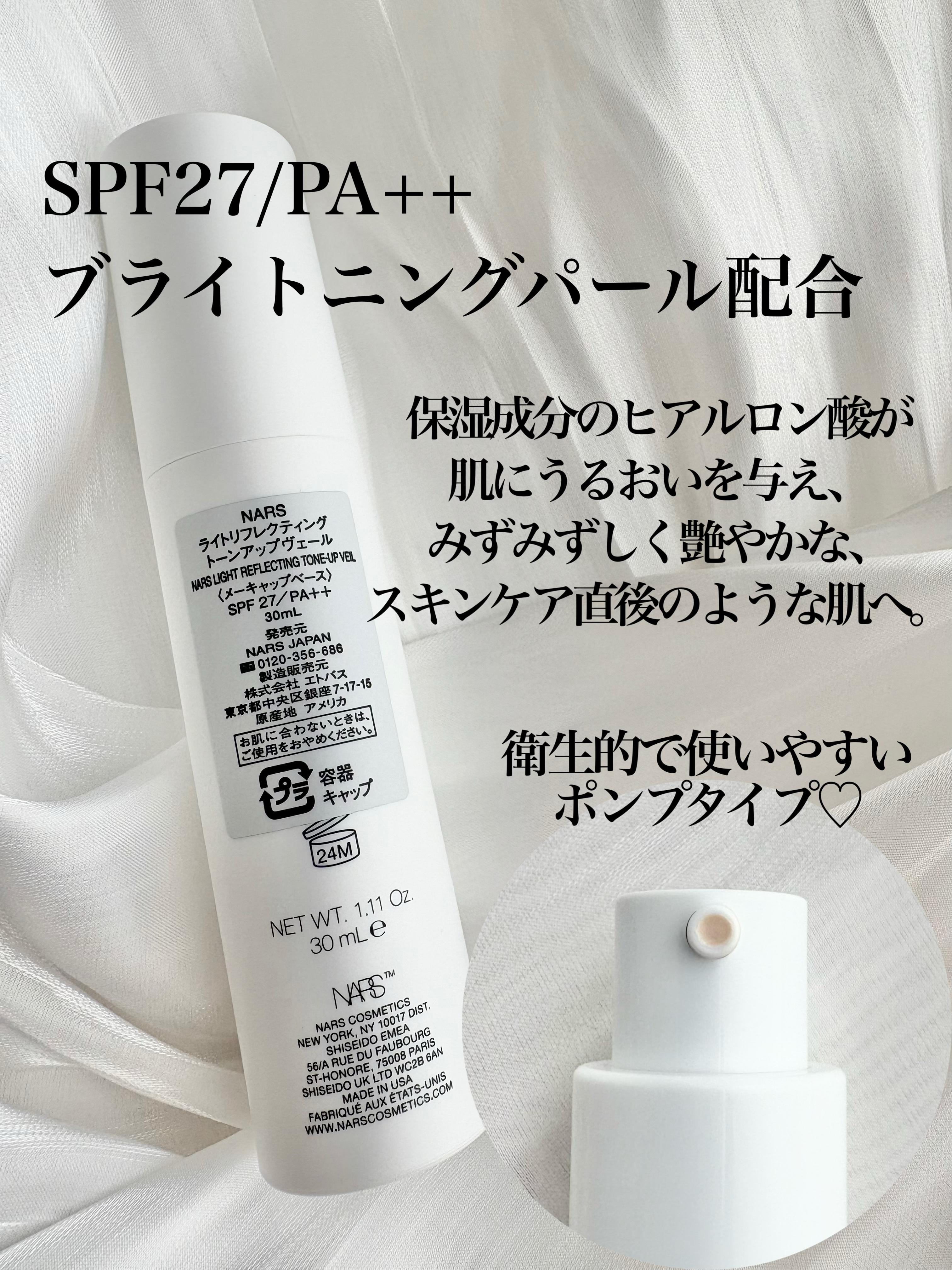 - SPF27/PA++ 瞬時に明るく、うるおい続く新体験、光の透明感プライマー 軽やかに。明るさ続く。 NARS史上初となるトーンアップタイプのプライマー「ライトリフレクティングトーンアップヴェール」は くすみを補正し、肌を整え、化粧持ちが長時間*持続する、明るい肌へと導きます。 スキンケア成分を81%配合した革新的なハイブリッド処方により、まるで美容液のようなテクスチャーで心地よく肌に 馴染みます。ブライトニング パール ブレンドが、光を柔らかく拡散し、くすみを晴らして、白浮きせずに透明度の高い肌 へと導きます。保湿成分のヒアルロン酸とトリプルシュガー コンプレックスが肌にうるおいを与え、みずみずしく艶やか な、まるでスキンケア直後のような肌へ。 ラディアンス リテンション コンプレックスが環境ストレス(大気中のちりやほこりなど)やブルーライトのダメージから 肌を守ります。肌を守り、整え、光と透明感で限りなく澄み渡る肌へ。 *24時間化粧持ち(ヨレ)データ取得済。(仕上がりには個人差があります) ・ブライトニングパールブレンド 光沢を放つパールとゴールデンパールを独自にブレンド。2種のパールが織り成すつや感で瞬時に肌を自然にトーンアップ。パールのブレンドにこだわることで、光をやわらかく拡散させることが可能となり、白浮きすることなく、くすみのない明るく澄み渡る肌に導きます。 ・トリプルシュガーコンプレックス 革新的にブレンドされた3種の砂糖の保湿効果により、うるおいに満ちた光を反射しやすい肌に整えます。 ・ラディアンスリテンションコンプレックス カカオペプチドとモリンガシードの組み合わせが、ブルーライトや環境ストレス(大気中のちりやほこりなど)から肌を守ります。肌荒れをしにくい状態を保つことで、より光を反射しやすい肌に整えます。 ・ヒアルロン酸 肌の水分量を保ち、柔軟性のあるなめらかな肌へと導きます。 ・SPF 紫外線吸収剤と紫外線拡散剤をブレンドしたSPFが紫外線のダメージから肌を守ります。