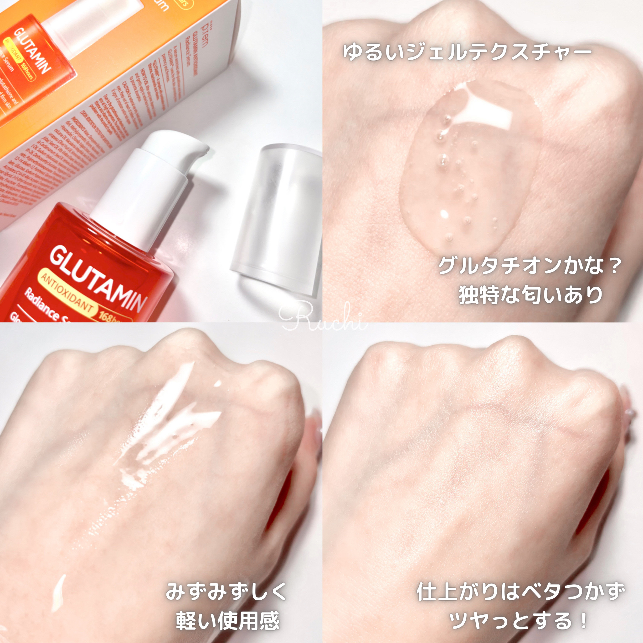 グルタチオン+ビタミン5種 = グルタミン™* トラネキサム酸 ▶︎輝く透明なツヤ肌。明るい肌トーン。 なめらかな水分セラム。みずみずしいテクスチャで、スっと肌になじむ。刺激は、少ない。 抗酸化効果でエイジングケア。・ツヤ、肌トーン、色素沈着ケア。