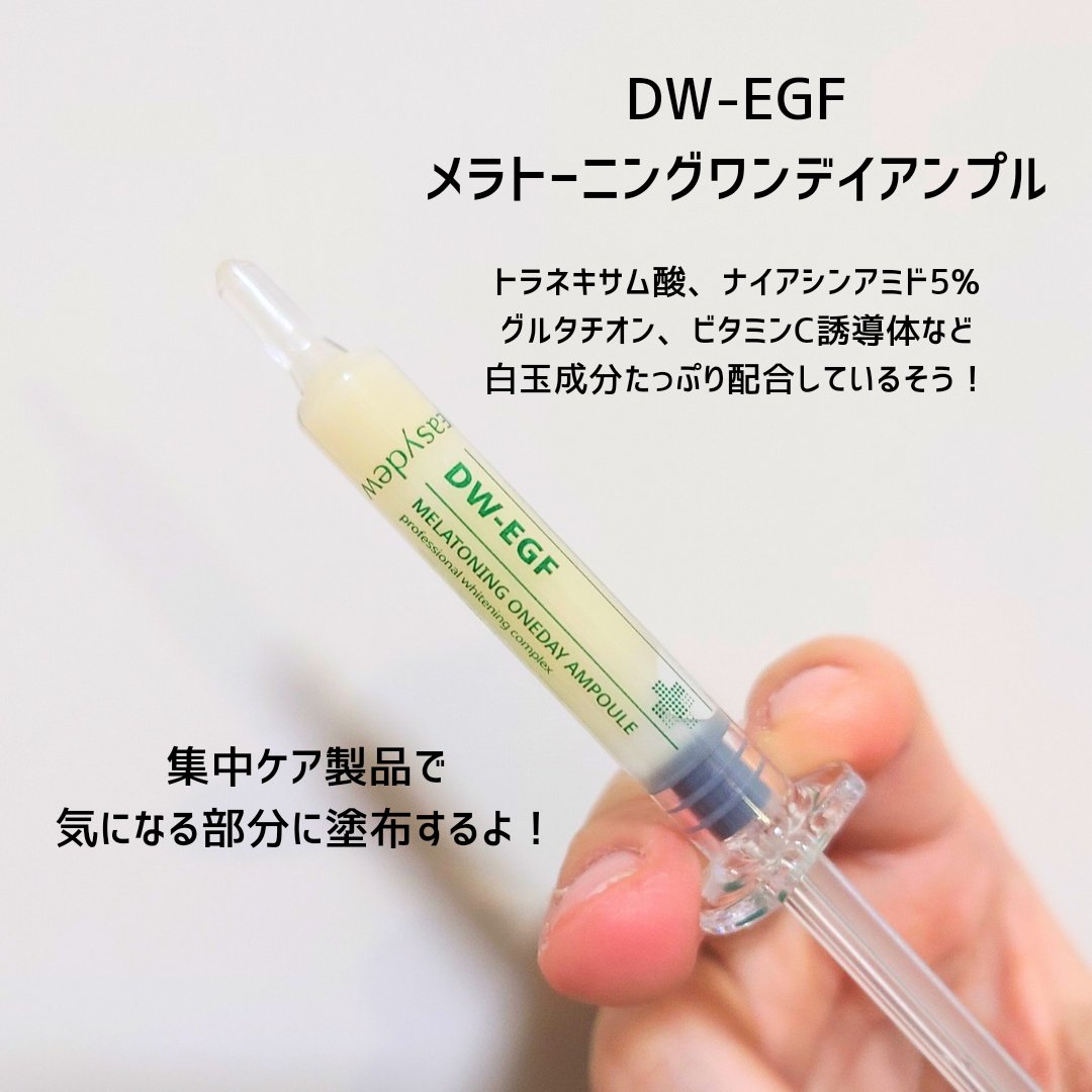 病院化粧品として始まったイージーデュー✦ 創業75年以上の歴史がある韓国のトップクラス製薬会社【大熊製薬(デウンセイヤク)】が30年以上の研究で生み出したブランドで、皮膚科でも実際に使われているんだって👩⚕️✨ メラトーニング ビタC トナーは肌のキメを整え、水分を与えてくれるようなうるおいたっぷりのテクスチャー。さっぱりしているけどしっとりとした使い心地。 メラトーニング ワンデイ アンプルはおうちで白玉注射?と話題のアンプル💉ˊ˗ ナイアシンアミド・グルタチオン・ビタミンC誘導体などの白玉成分と、独自の成分DW-EGFを配合でハリ・エイジングケアにも◎