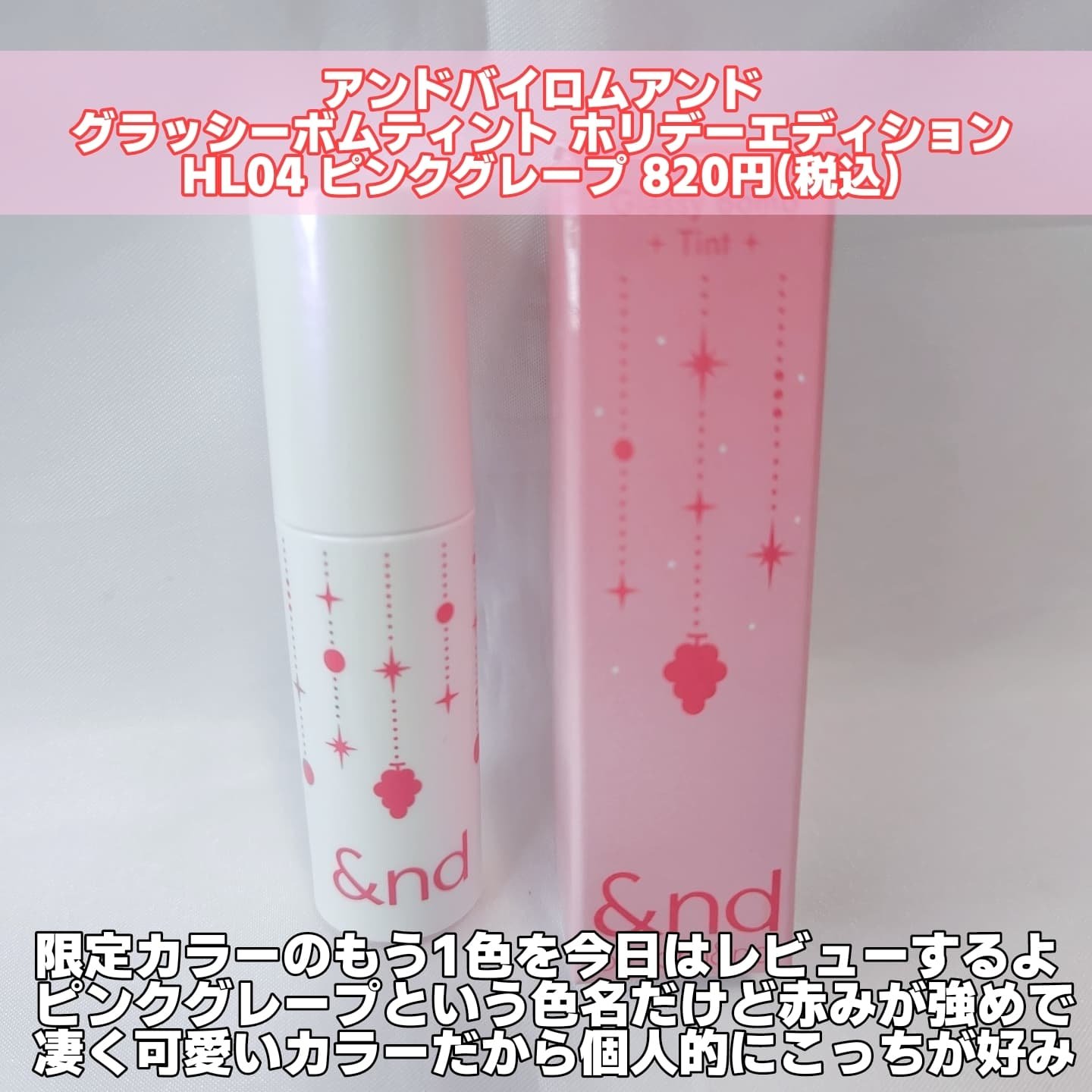 グラッシーボムティントのホリデーエディション ・ モモグレープ ・ピンクグレープ 初の香り付きティントで、気品漂うシャルドネの香りだそう たしかに甘い香りがします 淡めのヌーディーピーチカラーですが、ほんとに上品な色味!!!