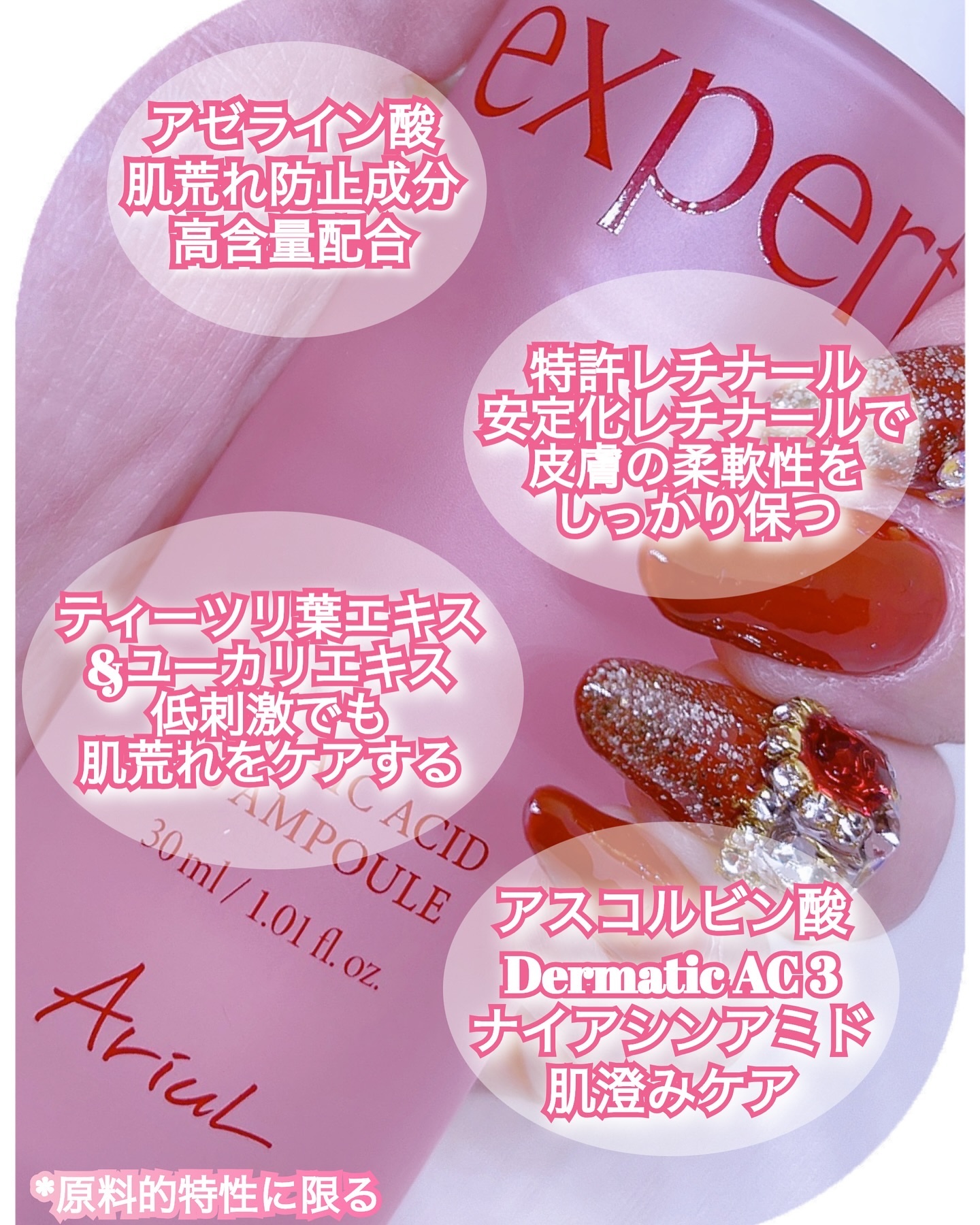 アゼライン酸で、秋冬の肌トラブルを回避したい😭⛄️✨ 今話題のアゼライン酸って、皮脂の分泌を抑えて毛穴の詰まりを軽減するんだって😳 そんなアゼライン酸が5%と高含量💫 しかも、レチノールより小じわが目立たなくなることが優れてる特許レチナールも配合💓 敏感性肌刺激テスト済みで、低刺激なのに肌荒れケアができるのも嬉しい❤️ トロみのある優しい保湿ベース処方でしっとりとした使用感だったから、私は夜に使うことが多いかな🌙