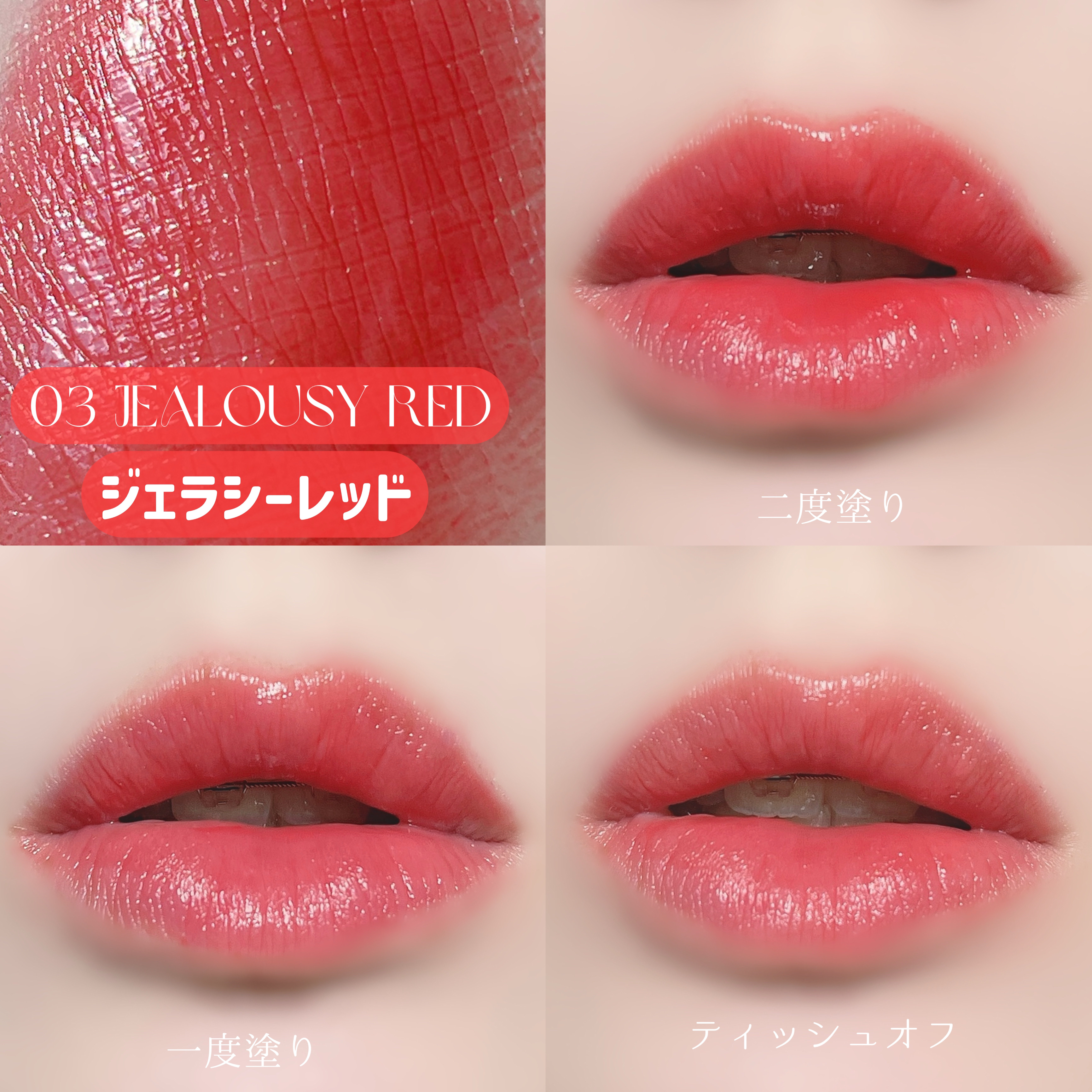なめらかなつけ心地と落ちにくさすごい✨ ツヤっとしていて透明感もあり☺️ 膜を薄く張ったようなしっとり感で、 塗ってから60秒ほど待ち、 ティッシュオフしてもそのしっとり感は 残っている印象🌼 さらに色移りしにくい仕上がりでした🤍 食べたり飲んだりした時もフチだけ 色残り現象は特になかったです🌱 肌なじみのいいコーラルピンク💕 青みがかわいいモーヴピンクカラー💕 ほどよいテラコッタオレンジ系カラー🧡 青みのあるチェリーレッドカラー🌹 ブラウンレッド系のカラー🤎 ディープレッドカラー🥀