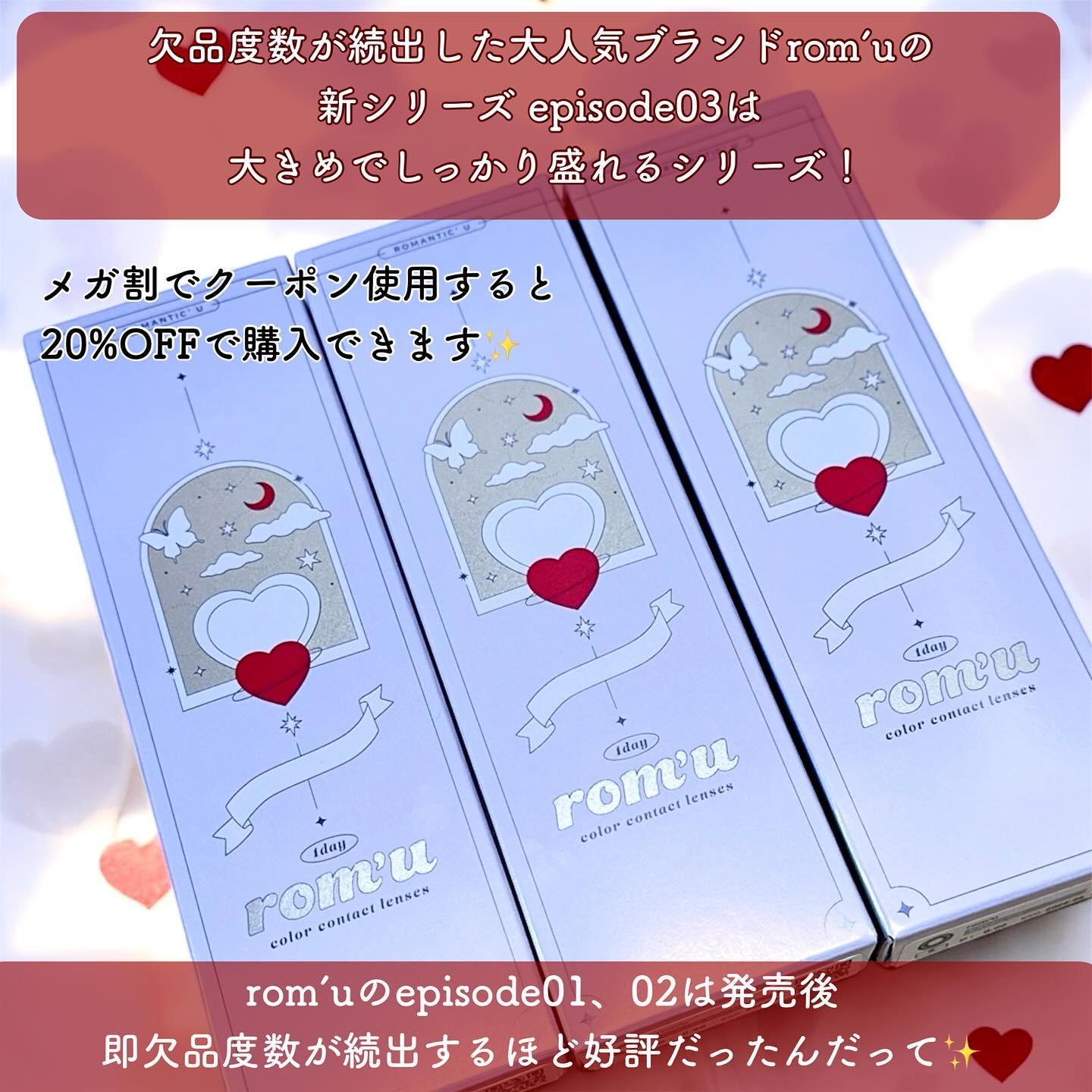 話題のカラコンブランド〝rom'u ロミュ〟から新シリーズ登場.ᐟ.ᐟ episode03は、センチメンタルな愛と欲望をコンセプトにあざとい瞳を演出してくれるよ❤︎ 太フチ×パープル 甘さのある、あざとかわいい瞳に。 Qoo10のメガ割で20%オフでお得に買えちゃうので、ぜひチェックしてみてねっ🛒´-